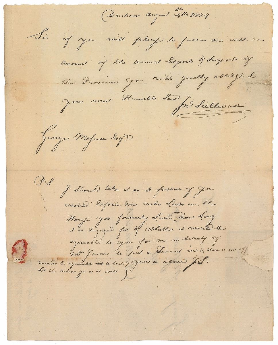 American general in the Revolutionary War and a delegate in the Continental Congress (1740–1795) who served as governor of New Hampshire and commanded the Sullivan Expedition in 1779. ALS signed “Jno. Sullivan,” one page, 7.5 x 9.5, August 4, 1774. Letter to George Meserve, in full: “If you will please to favour me with an amount of the annual Export & Imports of this Province, you will greatly oblige Sir your most Humble Serv’t.” Sullivan adds a lengthy postscript, in part: “I should take it as a favour if you would inform me who lives in the house you formerly lived in, how long it is engaged for & whether it would be agreeable to you for me in behalf of Mr. James to put a Tenant in.” Addressed on the reverse of the second integral page in Sullivan’s own hand. In fine condition, with old repaired areas of paper loss to fold edges.