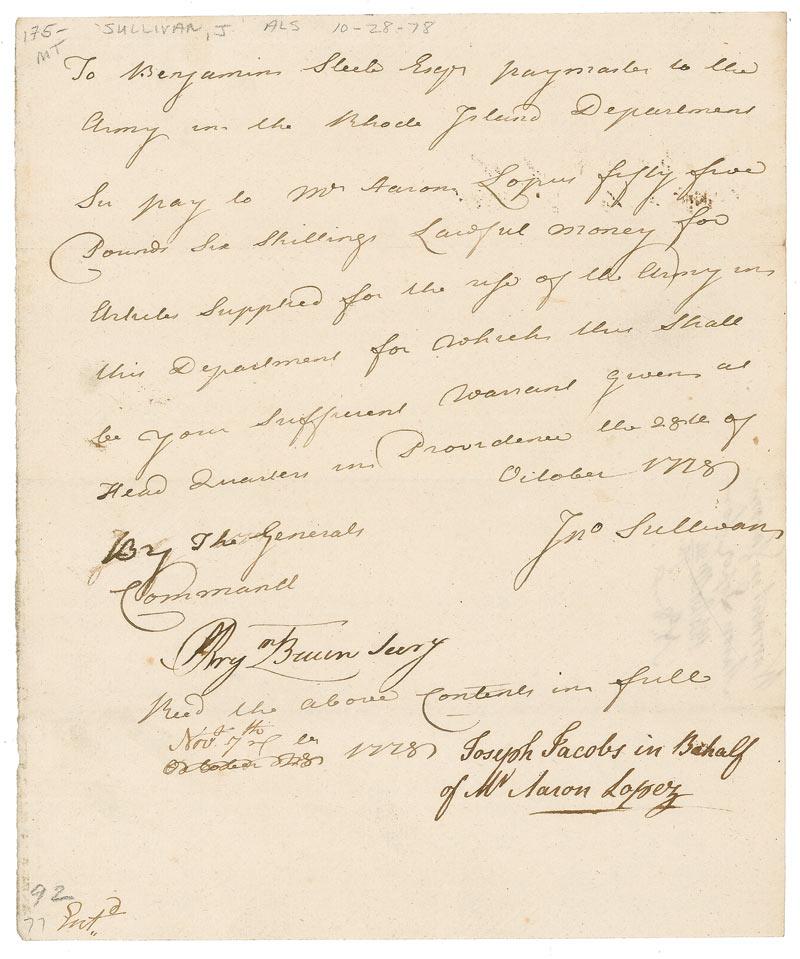 American general in the Revolutionary War and a delegate in the Continental Congress. Sullivan served as a major general in the Continental Army and as governor (or president) of New Hampshire. He is most famous for leading the Sullivan Expedition in 1779, a scorched earth campaign against the Iroquois towns that had taken up arms against the American revolutionaries. Revolutionary War-dated LS signed “Jno Sullivan,” one page, 7.5 x 9, October 28, 1778. Letter to Benjamin Stelle, ordering payment of 55 shillings to Aaron Lopez “for articles supplied for the rise of the Army.” Signed at the conclusion by Sullivan, and countersigned by two others. Several small pencil notations, some stray ink marks, and horizontal folds, otherwise fine condition.