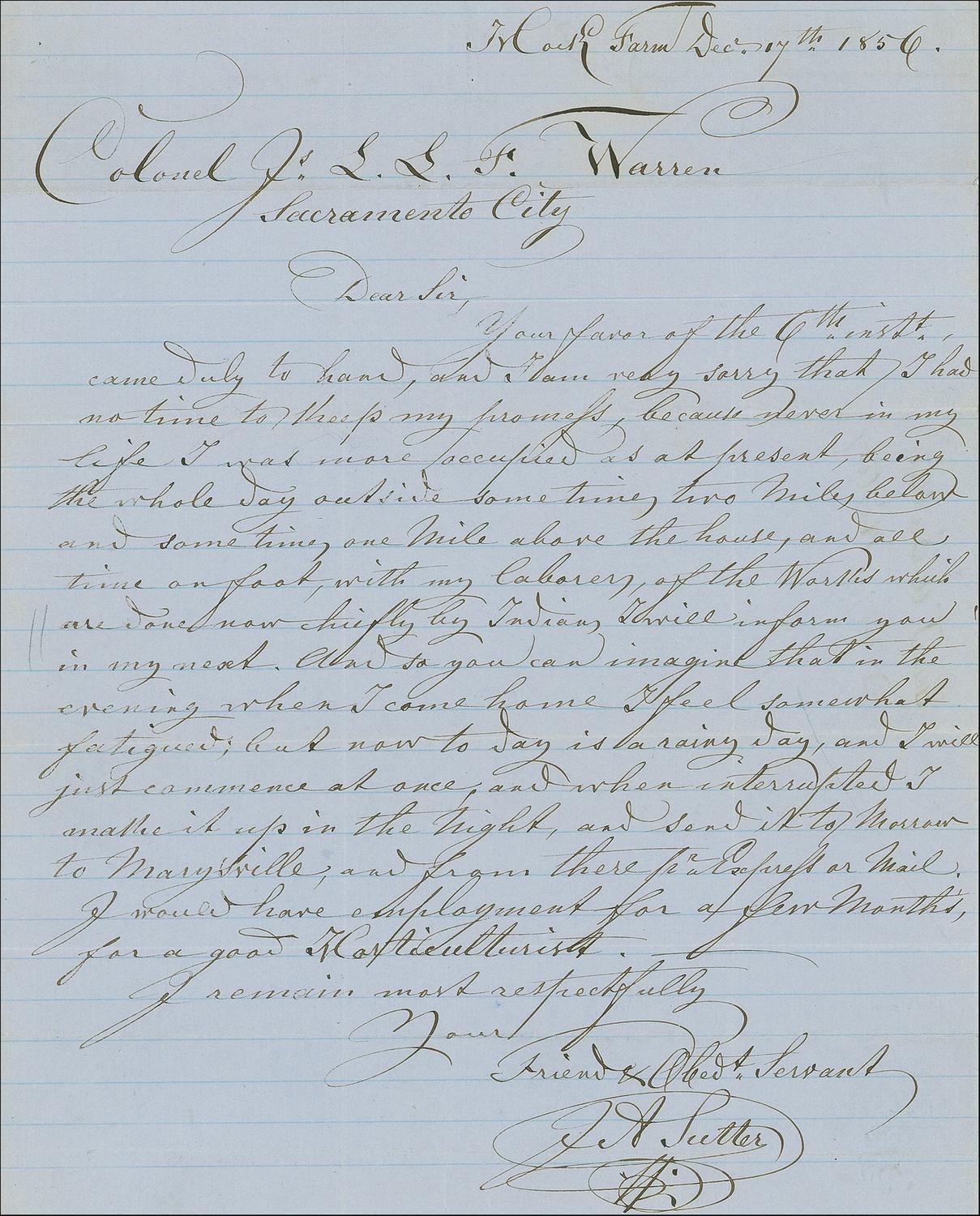 Seven years after the gold rush decimated his property, Sutter turned to farming as a livelihood. The work resulted in his feeling “somewhat fatigued,” and also frustrated by the work ethic of the Native Americans in his employment. He would later say the Indians would work for a week and then take a week off, using their wages to buy cheap whiskey and become drunk and disorderly in Marysville, the town Sutter references here. Native Americans would also only work if they were paid cash—opposed to a few years earlier when clothing and provisions would suffice. He also feared that his employees were staling from his fields, orchards, and vineyards, leading the California pioneer to later hire only white men. Many farmers including Warren, the original recipient of this letter, sympathized with Sutter’s plight and respected his contributions to California agriculture, honoring him with an appointment as vice president of the California Agricultural Society. In the end, neither such accolades, “a good Horticulturist,” hard work, nor employees of any color or creed could save him from falling into poverty. Interesting content as Sutter came to realize that his dream of a perfect society at Sutter’s Fort would never be achieved.