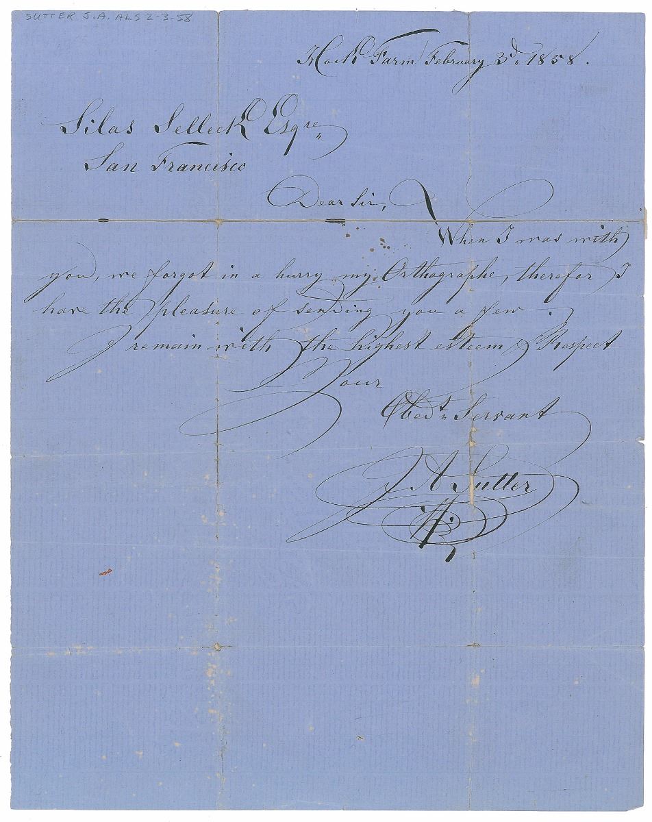 Californian pioneer (1803–1880) known for his association with the Gold Rush as the owner of Sutter’s Mill, where gold was first discovered by James W. Marshall. Rare ALS signed “J. A. Sutter,” one page, 7.75 x 9.75, February 3, 1858. Letter to Silas Selleck, a noted photographer in San Francisco. In full: “When I was with you, we forgot in a hurry my Orthographe, therefor I have the pleasure of sending you a few.” In very good condition, with repaired separations to intersecting folds (one vertical separation passing through the first letter of his last name, with slight paper loss affecting it), and scattered toning. Selleck was a noted prize-winning photographer in the area, and was awarded a bronze medal at the 1858 San Francisco Mechanics' Institute Exhibition for an ambrotype of Sutter; this portrait was judged ‘a well executed specimen of the art.’
