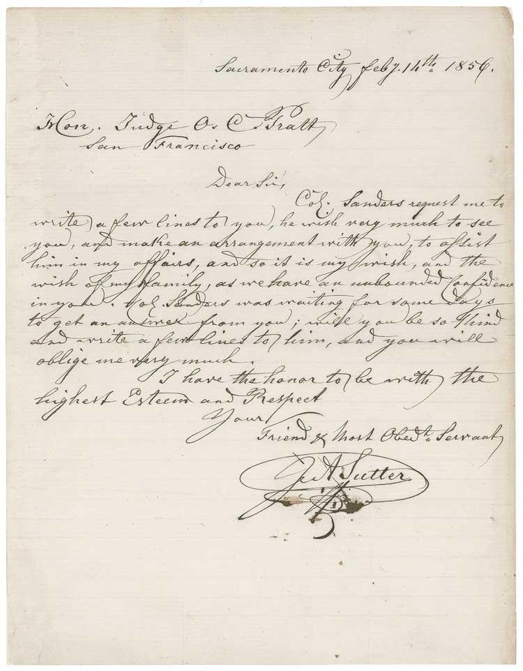 ALS signed “Jn. A. Sutter,” one page, lightly-lined, 8.25 x 10.5, February 14, 1856. Letter to Judge Orville C. Pratt. In full: “Col. Sanders request me to write a few lines to you, he wish very much to see you, and make an arrangement with you to assist him in my affairs, and so it is my wish, and the wish of my family, as we have an unbounded confidence in you. Col. Sanders was waiting for some days to get an answer from you; will you be so kind and write a few lines to him, and you will oblige me very much.” The letter has been cleanly and professionally backed, and shows some extra ink marks under signature, and light toning to edges, otherwise fine condition.
