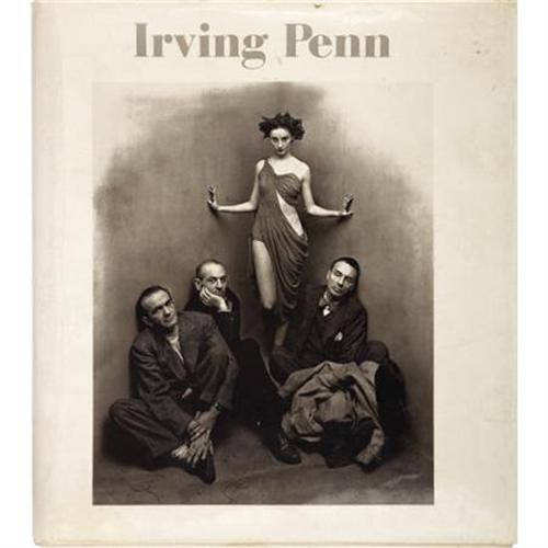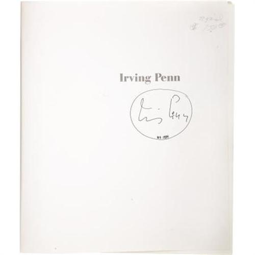 <B>John Szarkowski. </B></I><B><I>Irving Penn</B></I></B></I><B>.</B></I> New York: The Museum of Modern Art, 1984.<BR> <BR>First edition. Signed and dated by Irving Penn on the half-title page. Folio. 216 pages. 156 plates, including twenty-one in color. <BR><BR>Original white cloth with titles in gray on the spine and front board. Binding slightly shaken. Boards soiled and toned. Front free endpaper with a vertical crease along one edge. Long gift inscription in ink on the front free endpaper. Small stains to title page and following three pages. Dust jacket moderately toned with wear at the edges. Front panel shows former use as a "desk" with marks in blind. Good condition.<BR><BR>The work on offer, published in conjunction with an exhibition at The Museum of Modern Art, was the first comprehensive retrospective of Penn's work.<BR><BR><BR><b>Shipping:</b> Books & Catalogs (<a target="_blank" href="http://www.heritageauctions.com/common/shipping.php">view shipping information</a>)