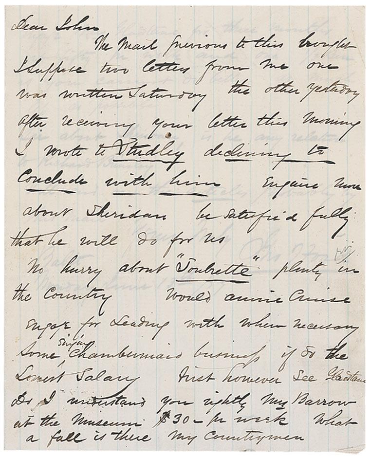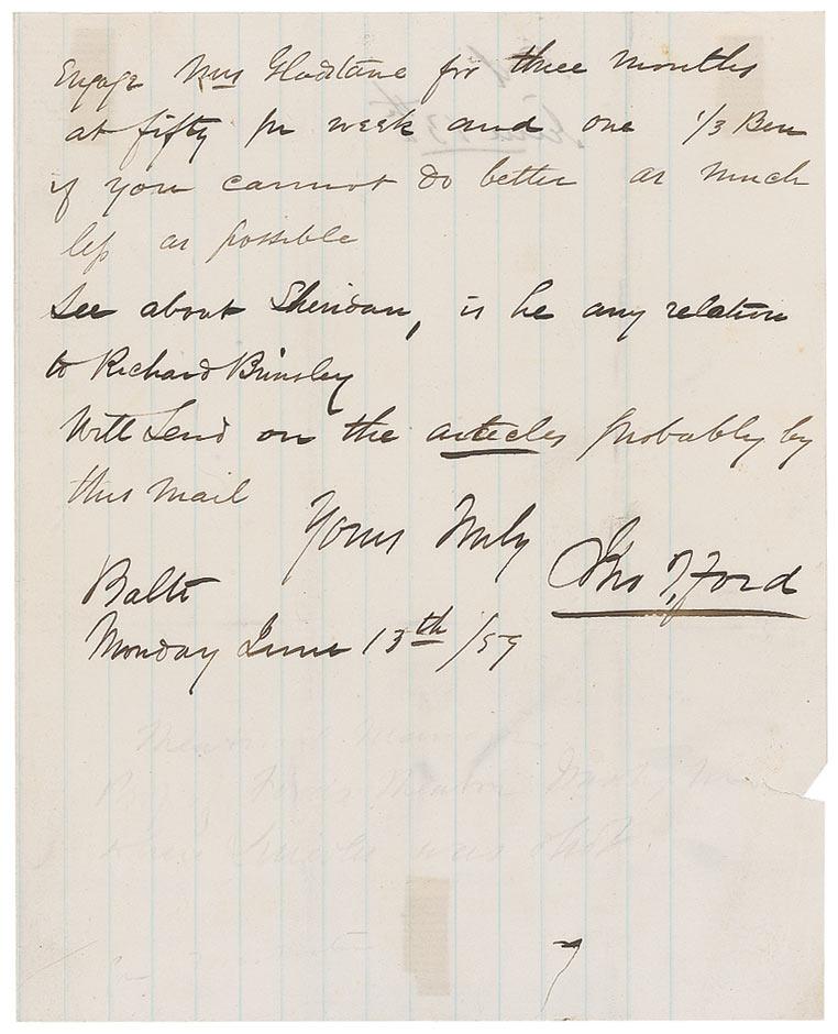 American theater manager (1829–1894), most famous for operating Ford's Theatre at the time of the Abraham Lincoln assassination . ALS, two pages, lightly-lined on two adjoining sheets, 6.25 x 8, June 13, 1859. Letter to “John,” John B. Wright, who would later be the stage manager at Ford’s Theatre on the night of Abraham Lincoln’s assassination. In full: “The Mail previous to this brought I suppose two letters from me one was written Saturday the other yesterday after receiving your letter this morning. I wrote to Studley declining to conclude with him. Enquire more about Sheridan be satisfied fully that he will do for us. No hurry about ‘Soubrette’ plenty in the country Would Annie Cruise engage for Leading with when necessary Some singing, chambermaid business if so the Lowest Salary. First however see Gladstone. Do I understand you rightly Mrs Barrow at the Museum $30–for week. What a fall is there my countrymen Engage Mrs Gladstone for three months at fifty pr week and one 1/3 Ben if you cannot do better at much less as possible. See about Sheridan, is he any relation to Richard Brinsley. Will Send on the article probably by this mail.” Some scattered light toning and creasing, edge tear to right edge of second page, and tape remnants to reverse of second page, otherwise fine condition. A ‘hands-on’ business letter. Ford and the name ‘Ford’s Theater’ are among the most recognizable in American history.