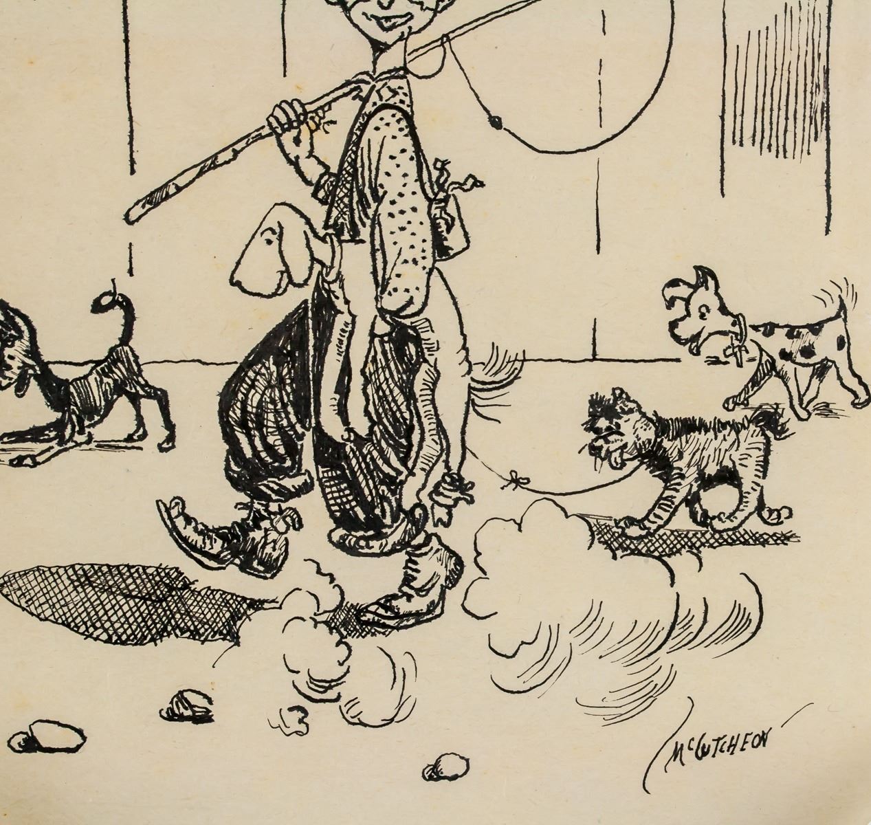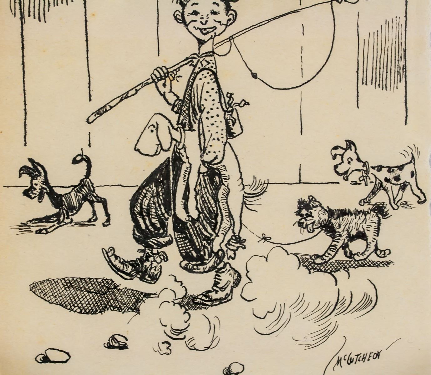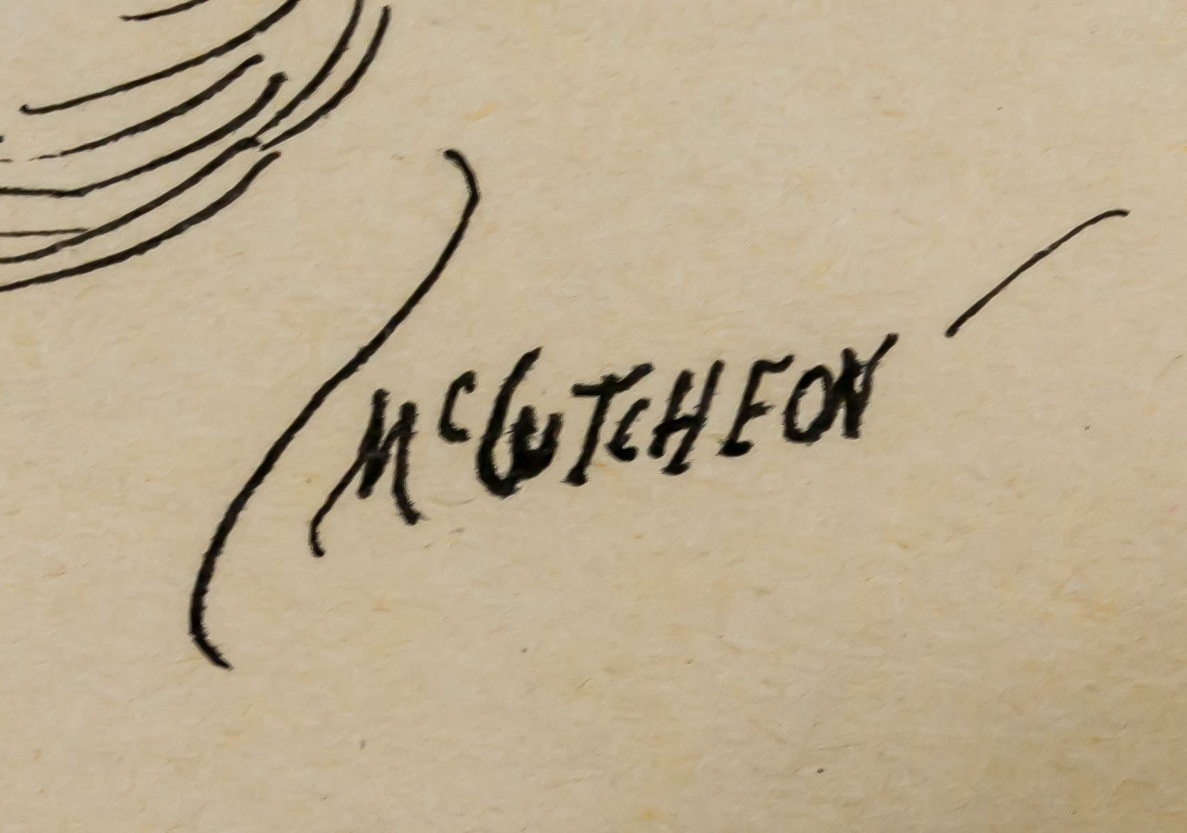 Ink on paper. Featuring a comic portrait scene of a man with a fishing rod and group of dogs. Signed McCutcheon on the lower right corner. Inscribed in pencil 1960 on the upper right corner. 16.5 x 15 cm (6.5 x 5.9 inches). PROVENANCE: Southern Ontario estate