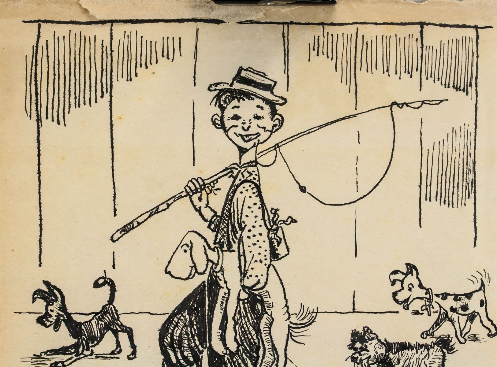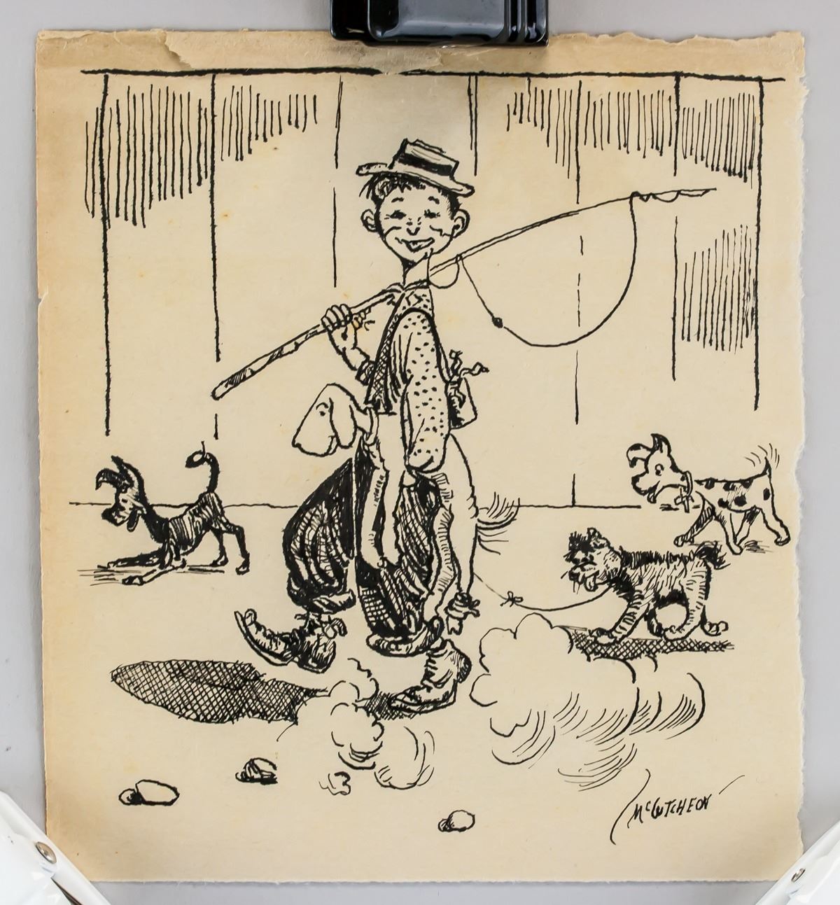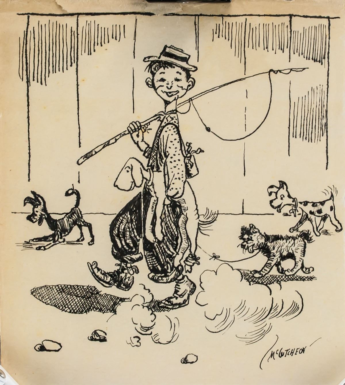 Ink on paper. Featuring a comic portrait scene of a man with a fishing rod and group of dogs. Signed McCutcheon on the lower right corner. Inscribed in pencil 1960 on the upper right corner. 16.5 x 15 cm (6.5 x 5.9 inches). PROVENANCE: Southern Ontario estate