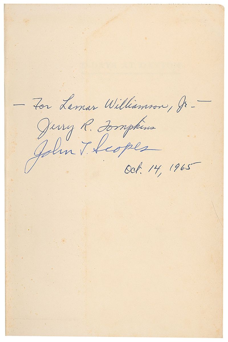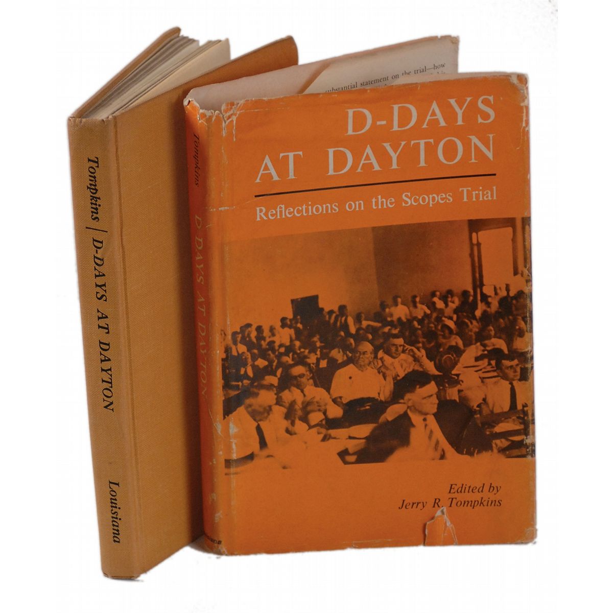 American educator (1900–1970) who defied state law in Tennessee by teaching the theory of evolution, precipitating the famous ‘Monkey Trial’ trial in 1925. He was convicted and received a nominal fine, but the decision was ultimately reversed on a technicality. Signed book: D–Days at Dayton. First edition. Baton Rouge: Louisiana State University Press, 1965. Hardcover with dust jacket, 6.25 x 9.25, 173 pages. Signed on the first free end page in blue ballpoint, “John T. Scopes,” and also signed and inscribed by the book’s editor, Jerry R. Tomkins, and dated October 14, 1965. Autographic condition: fine, with some scattered light toning to signed page. Book condition: VG-/VG-. Mustard cloth-covered boards; edges worn; bump to upper corner, affecting covers and textblock; mild foxing, soiling, and yellowing, mostly to textblock edges and first/last few pages; some small pencil notes/marks in margins; errata and pen note to rfep. Dust jacket has chips, tears, and creases along edges and folds; rubbing and light soiling; clipped corners; light foxing.