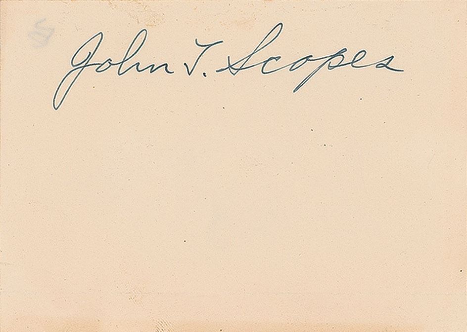 Two items: an ink signature, "John T. Scopes," on an off-white 4.5 x 3.25 sheet; and a very uncommon 10-inch Edison Record disc, with one side containing 'The John T. Scopes Trial (The Old Religion's Better After All),' and the other featuring 'The Death of Floyd Collins.' In overall fine condition, with a small area of thin paper above the first name.