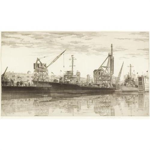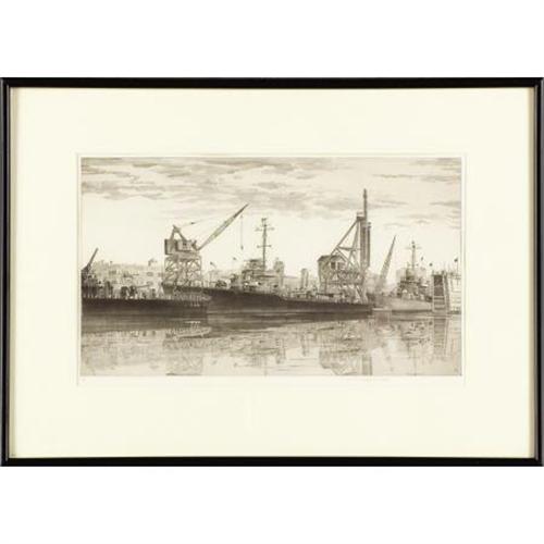<B>JOHN TAYLOR ARMS (American, 1887-1953)</B></I><BR><I>Destroyers in Wet Basin at Federal Shipbuilding and Drydock Company, South Kearny, N.J. U.S.S. Radford, Quick, Mervine.,</B></I> 1943<BR>Etching<BR>10 x 17-1/8 inches (25.4 x 43.5 cm)<BR> Ed. 875<BR>Signed and dated lower right: <I>John Taylor Arms 1943</B></I><BR>Inscribed lower left:<I> III </B></I>(for third state)<B>Condition Report:</B> Overall very good condition, with very minor mat burn, top hinged in upper corners.<BR><BR><b>Shipping:</b> Requires 3rd Party Shipping (<a target="_blank" href="http://www.heritageauctions.com/common/shipping.php">view shipping information</a>)