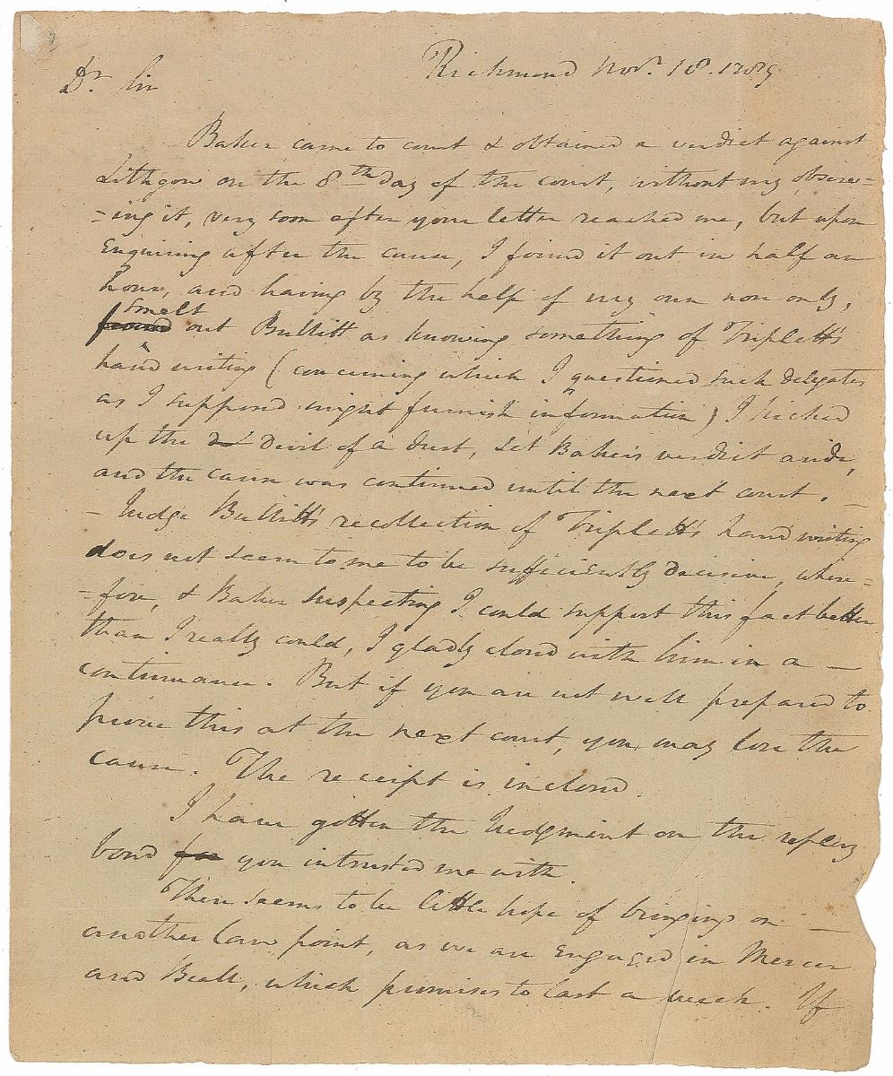 Politician and writer (1753–1824) known for his works that provided inspiration to the later states' rights and libertarian movements. ALS signed “John Taylor,” one page both sides, 6.75 x 8, November 18, 1789. Letter to Attorney General Charles Lee. In part: “Baker came to court & obtained a verdict against Lithgow…without my observing it…but upon enquiring after the cause, I found it out in half an hour, and…smelt out Bullitt as knowing something of Triplett’s hand writing…I kicked up the devil of a dust, set Baker’s verdict aside and the cause was continued until the next court. Judge Bullitt’s recollection of Triplett’s hand writing does not seem too me to be sufficiently decisive.” In fine condition, with a small edge chip.
