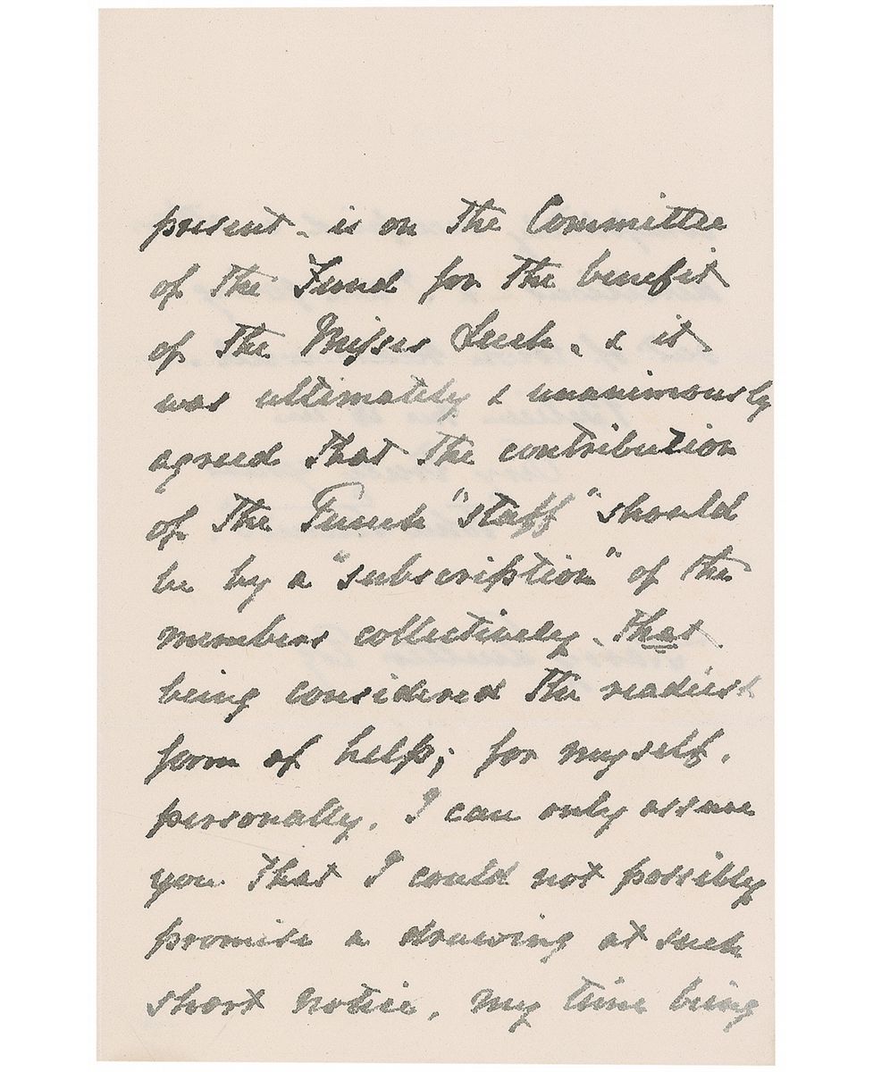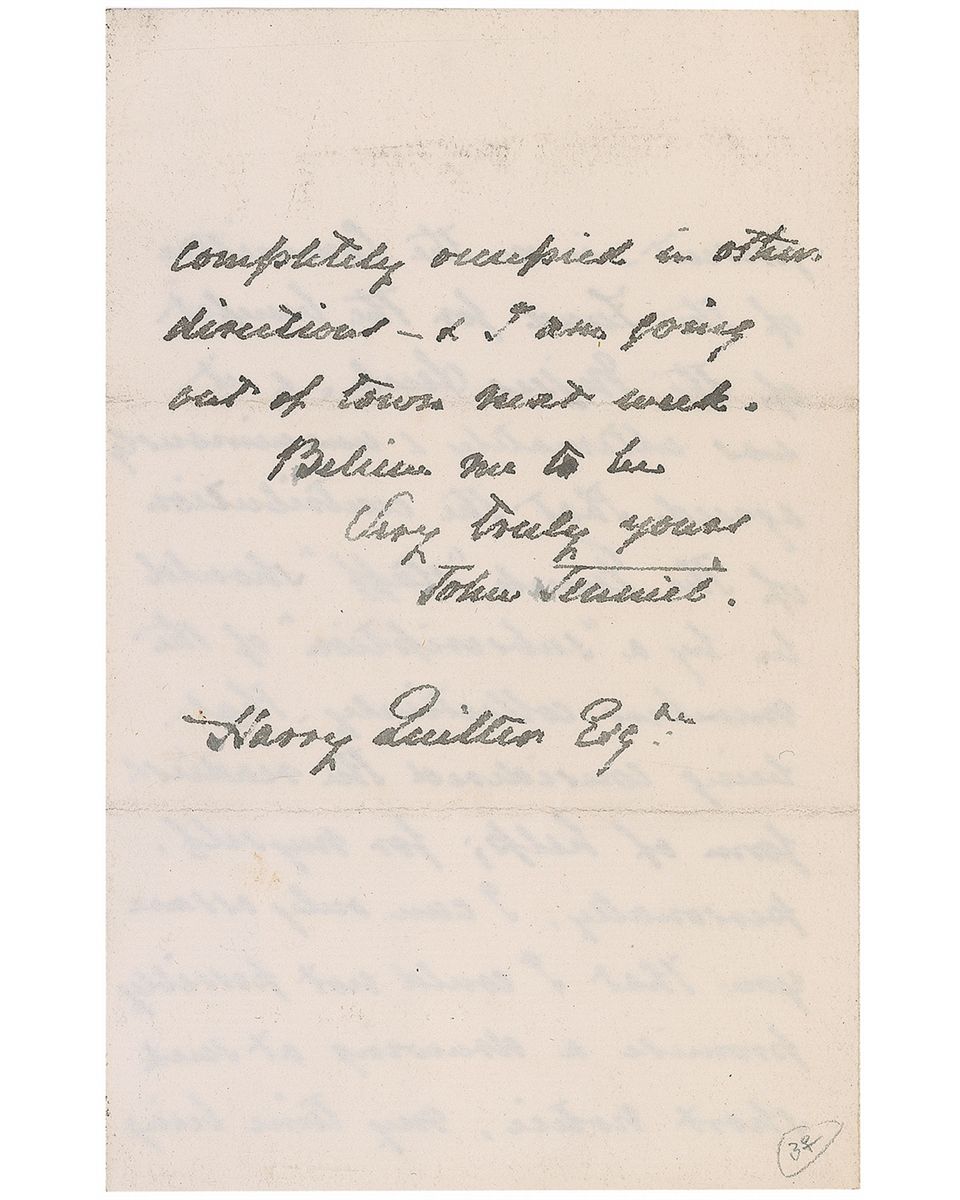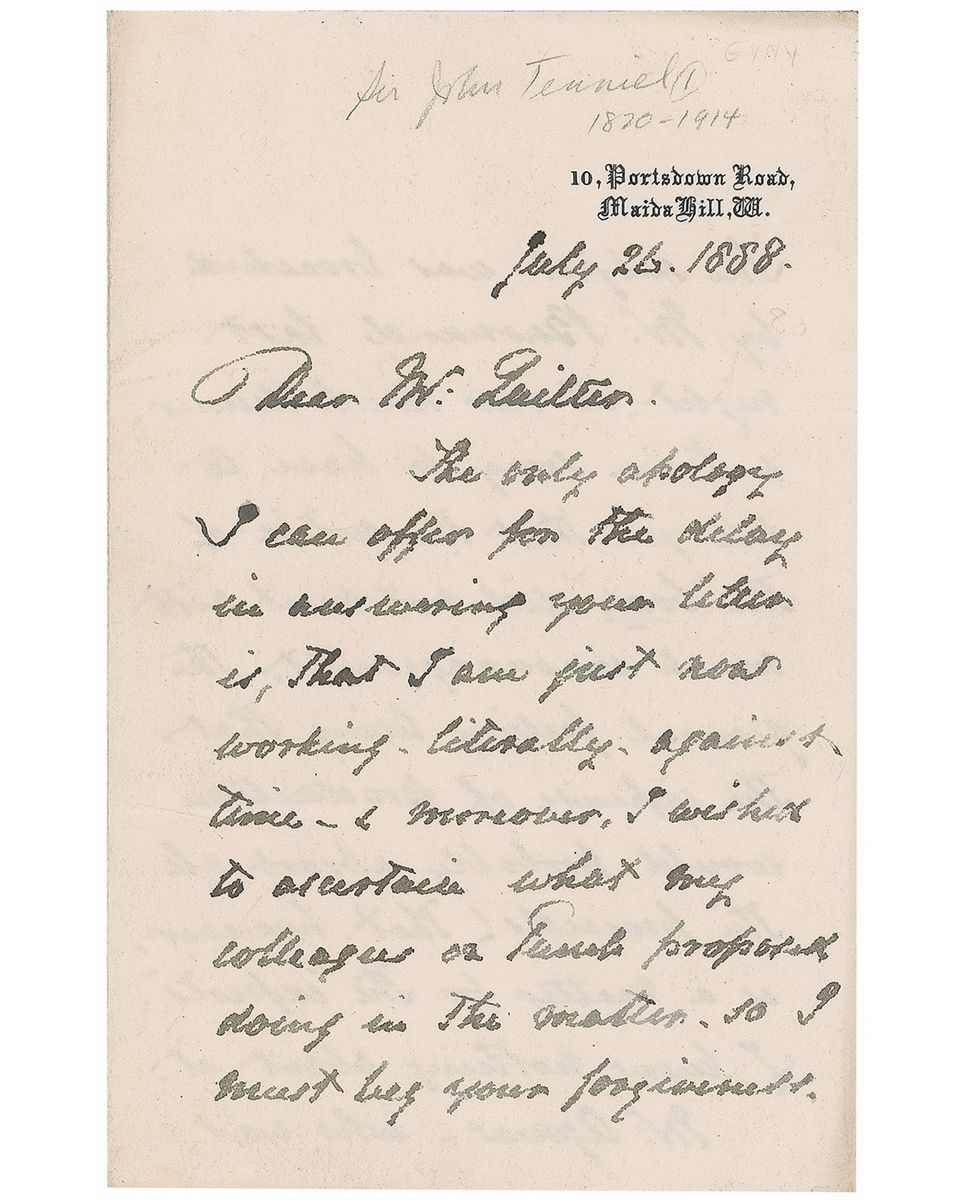 British illustrator (1820–1914) best known for his collaborations with Lewis Carroll on the Alice in Wonderland books. ALS, four pages on two adjoining sheets, 4.5 x 7, July 26, 1888. Letter to Mr. Quilter. In part: “The only apology I can offer for the delay in answering your letter is, that I am just now working—literally—against time—& moreover, I wished to ascertain what my colleagues on Punch proposed doing in the matter…The subject was broached by Mr. Burand last night, at our Punch dinner, & I am sorry to have to tell you that the notion of the ‘book’ did not meet with much encouragement, the general feeling being that the expense of production would probably absorb all the proceeds!…it was ultimately & unanimously agreed that the contribution of the Punch ‘staff’ should be by a ‘subscription’ of the members collectively, that being considered the readiest form of help; for myself, personally, I can only assure you that I could not possibly promise a drawing at such short notice.” In fine condition. Tenniel was the principal political cartoonist for Britain’s Punch magazine for over 50 years, which he references throughout this letter.