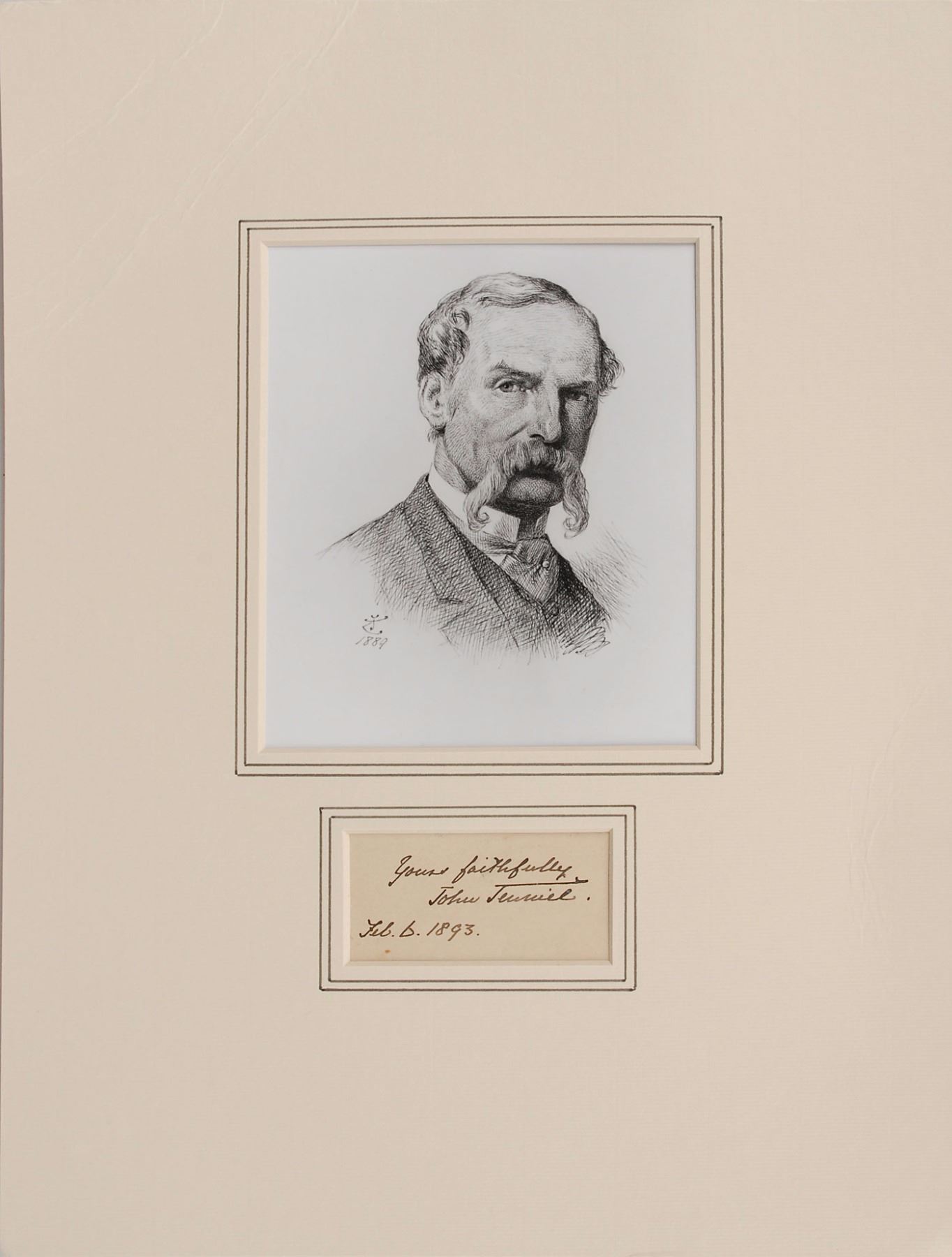 British illustrator (1820–1914) best known for his collaborations with Lewis Carroll on the Alice in Wonderland books. Scarce ink signature, "Yours faithfully, John Tenniel, Feb. 6, 1893,” on an off-white 3 x 1.5 card. Matted with an image of the artist to an overall size of 10.75 x 15.25. In fine condition.