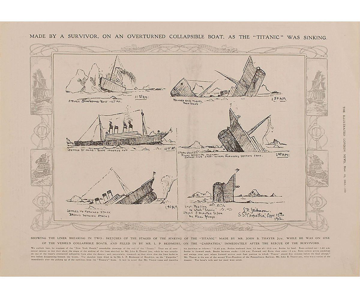 A full page from the May 11, 1912, Illustrated London News, 15.75 x 11, with a reproduction of a series of sketches of the sinking of the Titanic, as recounted by survivor John B. Thayer, Jr., while on board the Carpathia. Titled at the top, “Made By A Survivor, On An Overturned Collapsible Boat, As The ‘Titanic’ Was Sinking.” Caption at the bottom notes, “Sketches of the stages of the sinking of the ‘Titanic’ made by Mr. John B. Thayer Jun, while he was on one of the vessel’s collapsible boats, and filled in by Mr. L. P. Skidmore on the Carpathia.” The six images show the ship breaking in two and slowly disappearing below the surface. In fine condition, with some scattered light soiling.