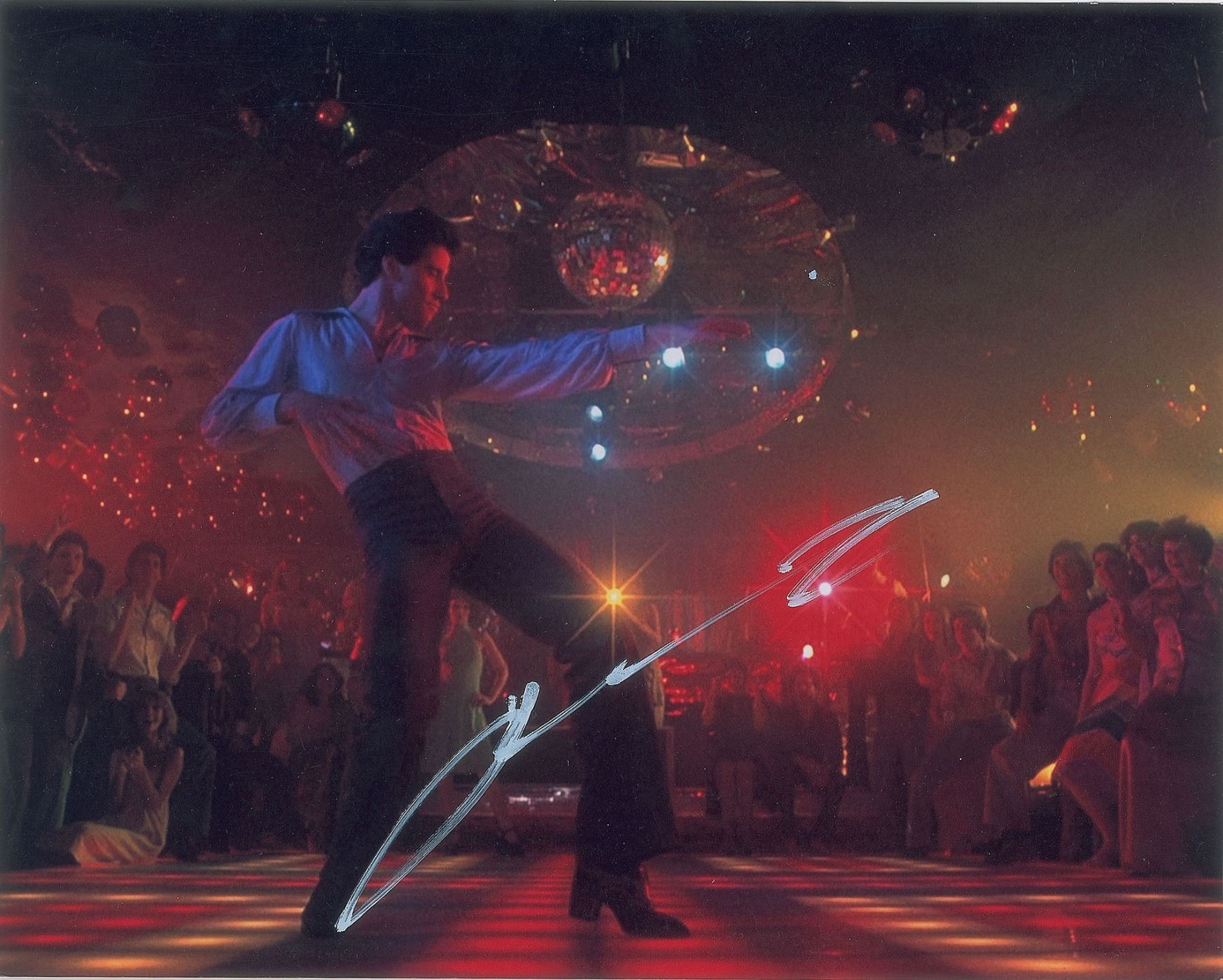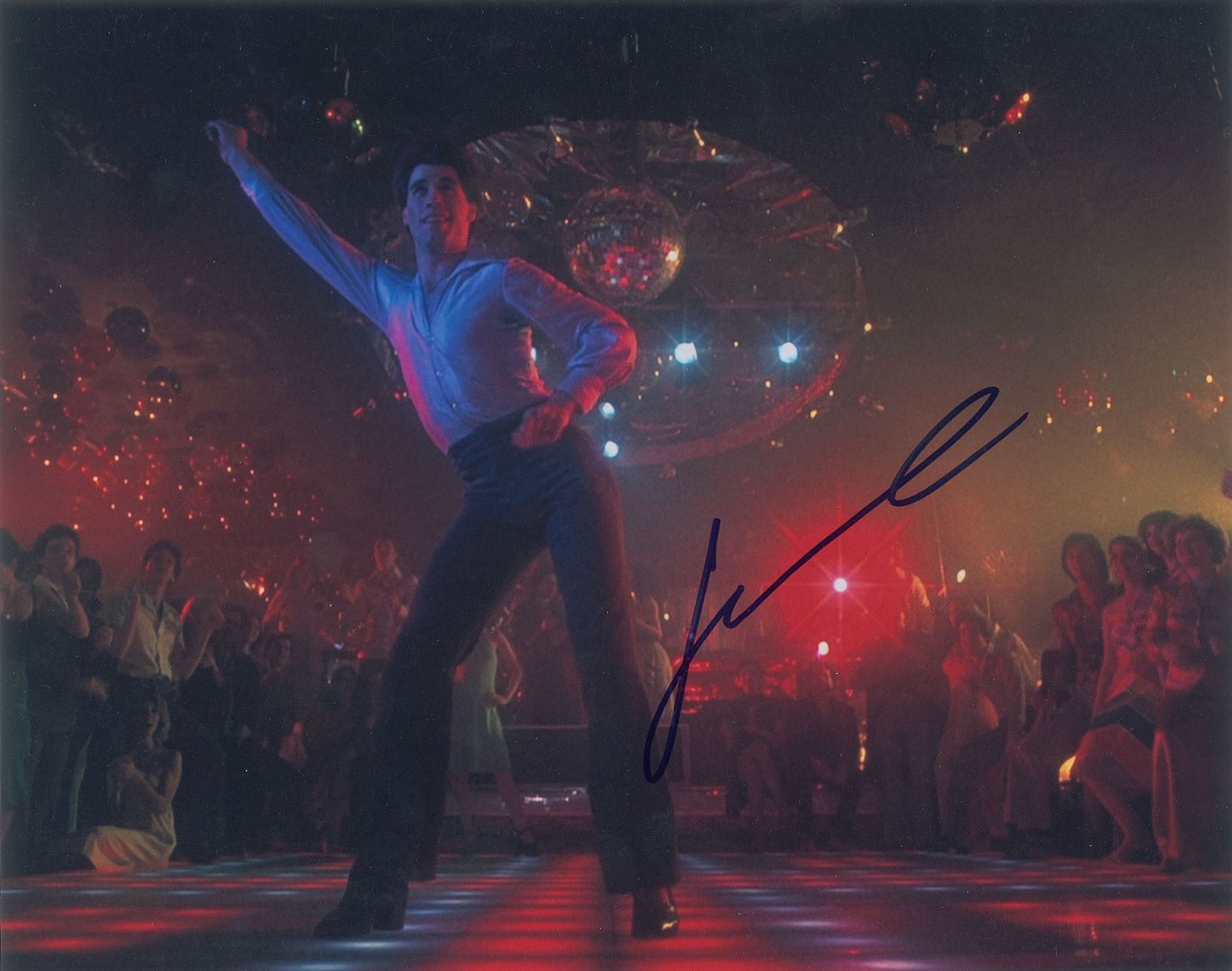 Three color satin-finish 10 x 8 photos of John Travolta as Tony Manero in Saturday Night Fever, each signed in blue felt tip or white ink. In overall fine condition, with some brushing to the signature on the close-up photo.