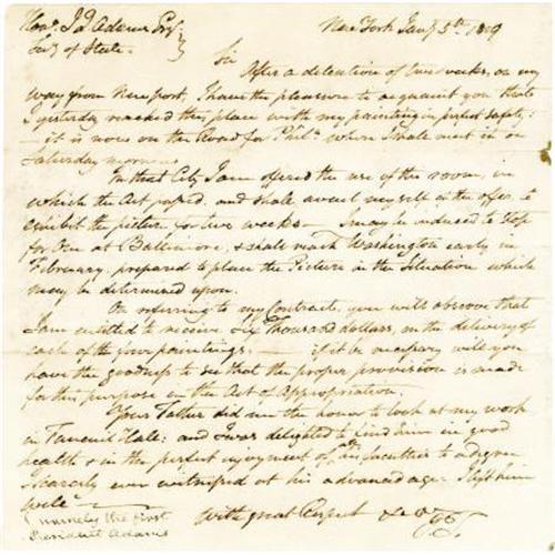 <B>John Trumbull Historic Autograph Letter Signed</B></I> "<I>J.T.,</B></I>" one page, 8" x 8". New York, January 5, 1819. To Secretary of State John Quincy Adams. Trumbull's retained copy; the letter he sent Adams is in the National Archives. In full, "<I>After a detention of two weeks on my way from New York, I have the pleasure to acquaint you that I yesterday reached this place with my painting in perfect safety; - it is now on the Road for Phila when I shall meet it on Saturday morning. In that City <B>I am offered the use of the room in which the Act passed, and shall avail myself at the offer to exhibit the picture for two weeks.</B></I> I may be induced to stop for one at Baltimore, & shall reach Washington early in February, prepared to place the Picture in the Situation which may be determined upon. On referring to my Contract, you will observe that <B>I am entitled to receive Six Thousand dollars, on the delivery of each of the four paintings.</B></I> If it be necessary will you have the goodness to see that the proper provision is made for this purpose in the Act of Appropriation. Your Father did me the honor to look at my work in Faneuil Hall and I was delighted to find him in good health & in the perfect enjoyment of all his faculties to a degree I scarcely ever witnessed at his advanced age. I left him well."</B></I> Contemporary note at bottom left in unknown hand: "<I>namely the first/President Adams.</B></I>" John Adams was then 83-years-old. On February 6, 1817, it was "Resolved by the Senate and House of Representatives of the United States of America, in Congress assembled, That the President of the United States be, and he is hereby, authorized to employ John Trumbull, of Connecticut, to compose and execute four paintings commemorative of the most important events of the American Revolution, to be placed, when finished, in the capitol of the United States."<BR><BR>From <I>Autobiography, Reminiscences, and Letters of John Trumbull</B></I> (1841): "The choice of the subjects, and the size of each picture, was left to the president, Mr. Madison. I immediately waited upon the president to receive his orders…when we came to speak of the subject, the president first mentioned the battle of Bunker Hill…My reply was, 'that if the order had been (as I had hoped) for eight paintings, I should have named that first; but as there were only four commanded, I thought otherwise…the surrender of General Burgoyne at Saratoga, and that of Lord Cornwallis at Yorktown, seemed to me indispensable. 'True,' replied he, 'you are right; and what for the civil subjects?' 'The declaration of independence, of course.' 'What would you have for the fourth?' 'Sir,' I replied, 'I have thought that one of the highest moral lessons ever given to the world, was that presented by a the conduct of the commander-in-chief, in resigning his power and commission as he did, when the army, perhaps, would have been unanimously with him, and few of the people disposed to resist his retaining the power which he had used with such happy success, and such irreproachable moderation. I would recommend, then, the resignation of Washington. After a momentary silent reflection, the president said, 'I believe you are right, it was a glorious action.' The price was settled, at eight thousand dollars for each painting, and, as soon as the new administration was formed under Mr. Monroe, the secretary of state was charged to prepare a contract on these principles, which was done."<BR><BR>On March 15, 1817, a contract was made between Trumbull and Monroe's Secretary of State, Richard Rush, for four paintings: "1st. The Declaration of Independence; 2nd. Surrender of the British to the American forces at Saratoga; 3rd. The Surrender of the British to the American forces at Yorktown; 4th. The Resignation of General Washington at Annapolis. And the said John Trumbull engages, that each of the aforesaid paintings shall have a surface of not less than eighteen feet by twelve feet, with figures as large as life…" Trumbull was paid $8,000 upon signing the contract and was to receive $6,000 upon delivery of each of the four paintings. On March 3, 1819, two months after Trumbull wrote this letter to Secretary of State J.Q. Adams, Congess appropriated "For the second payment to John Trumbull, for paintings agreeably to his contract with the Secretary of State, made in pursuance of a resolution of Congress, of the sixth of February, eighteen hundred and seventeen, six thousand dollars." Trumbull was paid treasury warrant No. 234, dated March 4, 1819, for $6,000. He was paid $6,000 for each of the three remaining paintings in 1820, 1822, and 1824. The paintings were placed in the Rotunda of the U.S. Capitol in 1824 where they hang today. The letter has been expertly strengthened on verso with tissue and is in fine condition. A remarkable letter relating to one of the, if not <I>the</B></I> most famous of all American paintings. This letter is ideal to frame and display with a reproduction of the actual painting.<BR><BR><b>Shipping:</b> Flat Material, Small (<a target="_blank" href="http://www.heritageauctions.com/common/shipping.php">view shipping information</a>)
