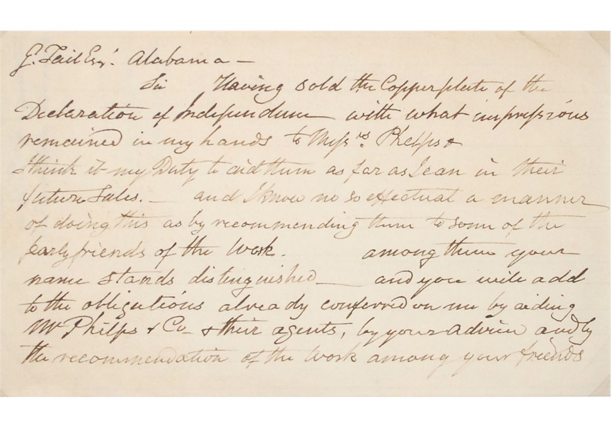 Partial unsigned ALS, one page, 7.5 x 4.5, no date. Beginning of a letter to a gentleman in Alabama. In part: “Having sold the copper plate of the Declaration of Independence…to Mr. Phelps…I think it my duty to aid them as far as I can in their future sales and I know no so effectual a manner of doing this as by recommending them to some of the early friends of the work.” Double-matted and framed with a portrait of Trumbull and a color image of his painting to an overall size of 22 x 24. In fine condition. Oversized.