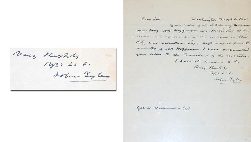 John Tyler autograph letter signed as Vice President, dated 8 March 1841 from Washington. Tyler wrote only a few letters during his short 34-day stint as Vice President, making this letter exceedingly rare. Addressed to George Williamson, Tyler recommends a political appointment for Minister to Vienna, ''...Your letter of the 15 February recommending Mr. Hoffman as Minister to Vienna reached me since my arrival in this City, and entertaining a high respect for the character of Mr. Hoffman, I have submitted your letter to the President of the U. States...'' With bold, underlined ''John Tyler'' signature at close. Letter has some tape remnants from mounting on verso, else near fine condition.