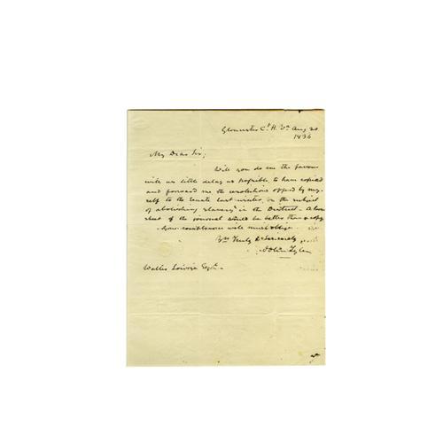 <B>John Tyler Autograph Letter Signed</B></I> "<I>John Tyler.</B></I>" A letter written and signed by John Tyler, one page, 7.6" x 9.9", Gloucester County, Virginia, August 20, 1836. The content is of incredible interest as it has to do with the issue of slavery. It reads, "<I>My Dear Sir; Will you do me the favor with as little delay as possible to have copied and forward me, the resolutions offered by myself to the Senate last winter, on the subject of abolishing slavery in the District- A loose sheet of journal would be better than a copy. Your compliance will much oblige.</B></I>" <BR><BR>Tyler is writing to Mr. Walter Lowrie Esquire, Secretary of the Senate. This letter was written before Tyler assumed the Vice Presidency and Presidency. Before his role in these two positions Tyler served as a United States Senator for the state of Virginia. Tyler was pro-slavery throughout his political career, and often opposed motions to abolish it in certain districts of the United States. <BR><BR>"His Accidency" as political opponents called him was one of the first presidents to go against his party's ideas and make decisions based on his own logic and merit. For this he earns the distinction of being the only president to leave office "without a party." He even named his home Sherwood Forest, considering himself somewhat of a political outlaw! <BR><BR>The letter is in fine condition, with small areas of ink smudging in the body of the letter, dark smoke stains on the upper edge, and the expected fold lines. The letter comes complete with a typed transcript of the document. Now your collection can be complete with "Tyler too!" From the Henry E. Luhrs Collection. Accompanied by LOA from PSA/DNA.
