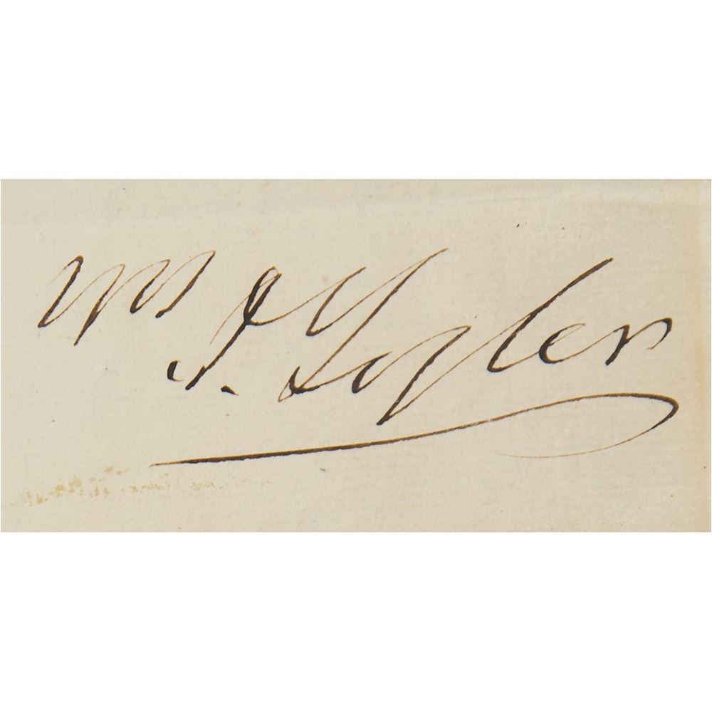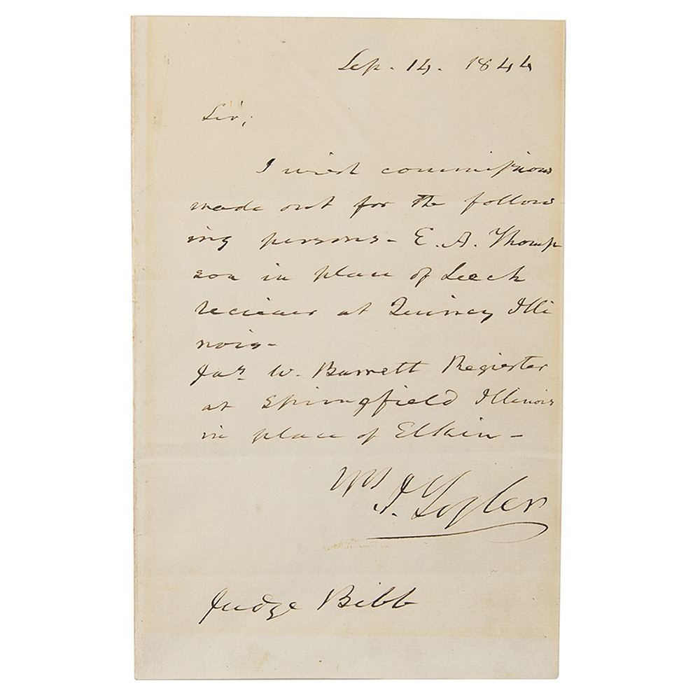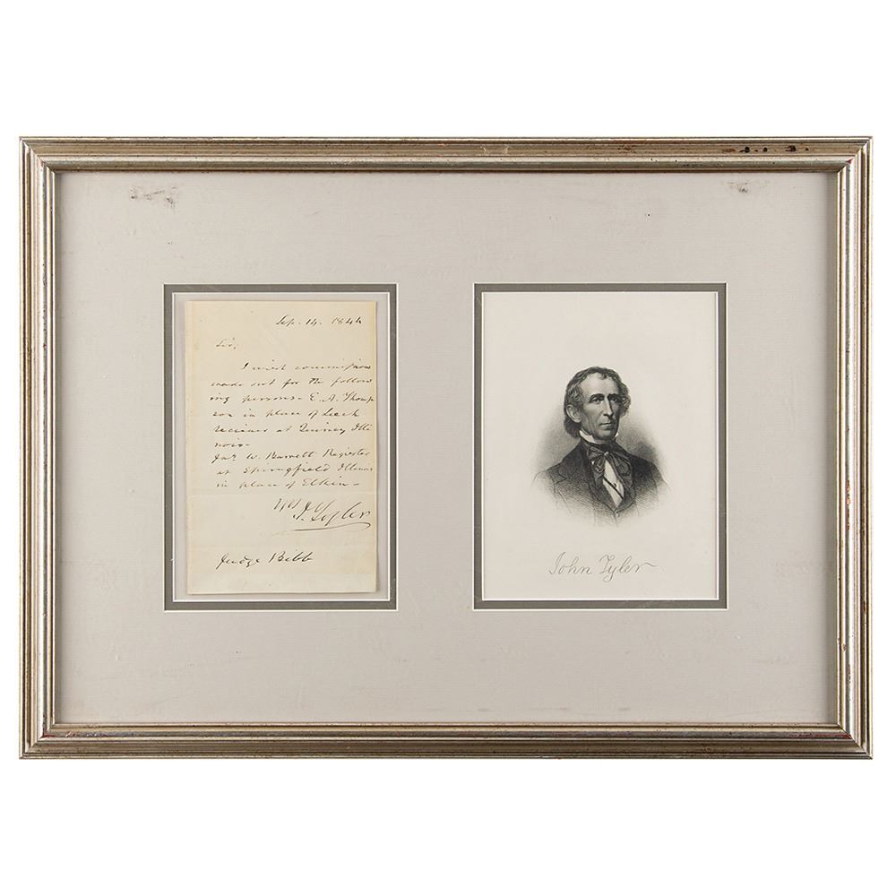 Desirable ALS as president signed "J. Tyler," one page, 5 x 7.5, September 14, 1844. Handwritten letter to "Judge Bibb," in full: "I wish commissions made out for the following persons"”E. A. Thompson in place of Leech receiver at Quincy, Illinois. Jas. W. Bennett Register at Springfield Illinois in place of Elkin." Handsomely mounted, double-matted, and framed with an engraved portrait (bearing a facsimile signature) to an overall size of 22 x 16. In fine condition.