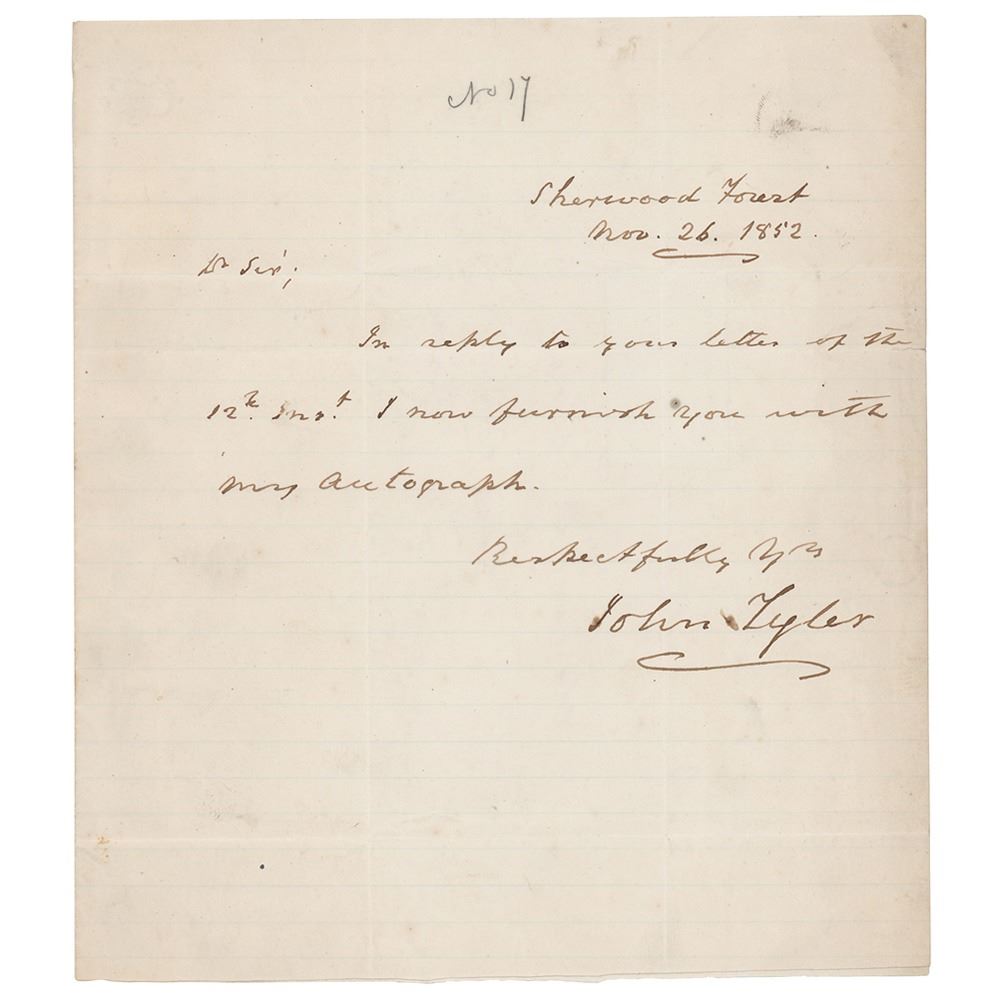 ALS, one page, 7.75 x 8.75, November 26, 1852. Handwritten letter to Clement C. Cline, in full: "On reply to your letter of the 12th Inst. I now furnish you with my autograph." In very good to fine condition, with light creasing and a trimmed bottom edge; the integral address leaf has old mounting remnants, and the franking signature has been clipped off.