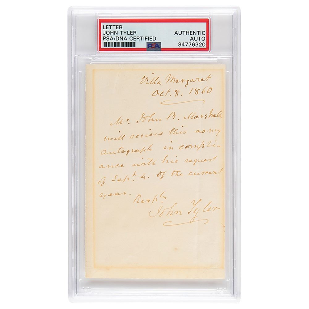 ALS, one page, 3.5 x 5.25, October 8, 1860. Handwritten letter from his summer home, "Villa Margaret," in full: "Mr. John B. Marshall will receive this as my autograph in compliance with his request of Sept. 4 of the current year." In fine condition, with toning from prior display. Encapsulated in a PSA/DNA authentication holder.