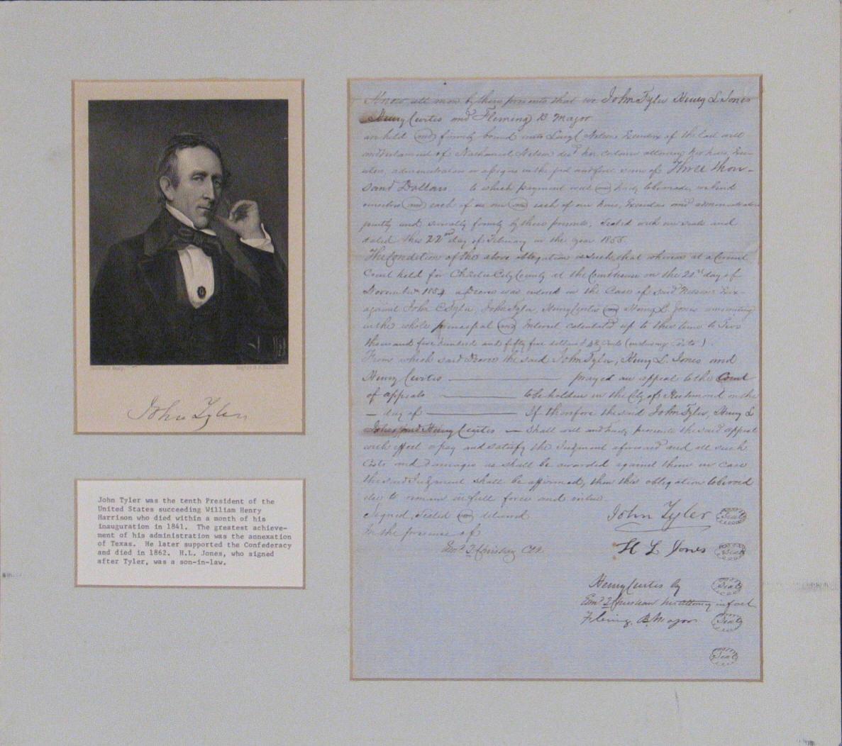 Manuscript document signed ''John Tyler'', dated 22 February 1855 regarding the ''last will and testament of Nashamid Nelson.'' Also signed by parties involved in the will, Henry Jones, Henry Curtis and Fleming Major. Lengthy document on blue-gray paper measures 8'' x 11.5'', custom matted and framed with a portrait engraving and biographical information of Tyler, to a size of 16'' x 14.5''. Minor staining, overall in very good condition.