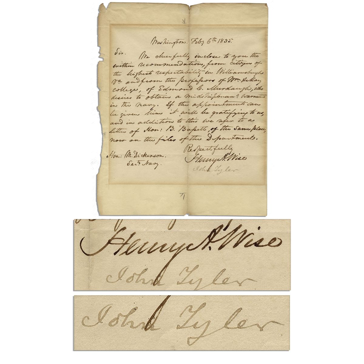 John Tyler document signed as Senator of Virginia, dated 6 February 1835. Countersigned by Virginia Congressman Henry A. Wise, document is addressed to Secretary of the Navy M. Dickerson and reads: ''We Cheerfully enclose to you the written recommendations, from citizens of the highest respectability in Williamsburg Virginia...of Edmond C. Murdaugh, who desires to obtain a Midshipsman & Warrants in the Navy. If the appointment can be given him it will be gratifying to us, and in addition to this we refer to a letter of Hon. B. Bussett, of the same place, now on the files of the department. Respectfully, Henry A. Wise / John Tyler''. Document on one page measures 8'' x 9.75''. Uneven left edge, tape residue to verso and minor toning. Very good. Also includes a 7.25'' x 10'' portrait print of Tyler.