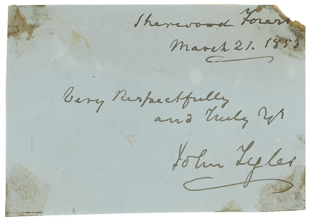 Ink signature, "Sherwood Forest, March 21, 1853, Very Respectfully and Truly Yrs, John Tyler," on a light blue 4.75 x 3.25 sheet. In very good to fine condition, with a missing upper right corner tip, and staining from old mounting residue on the reverse.