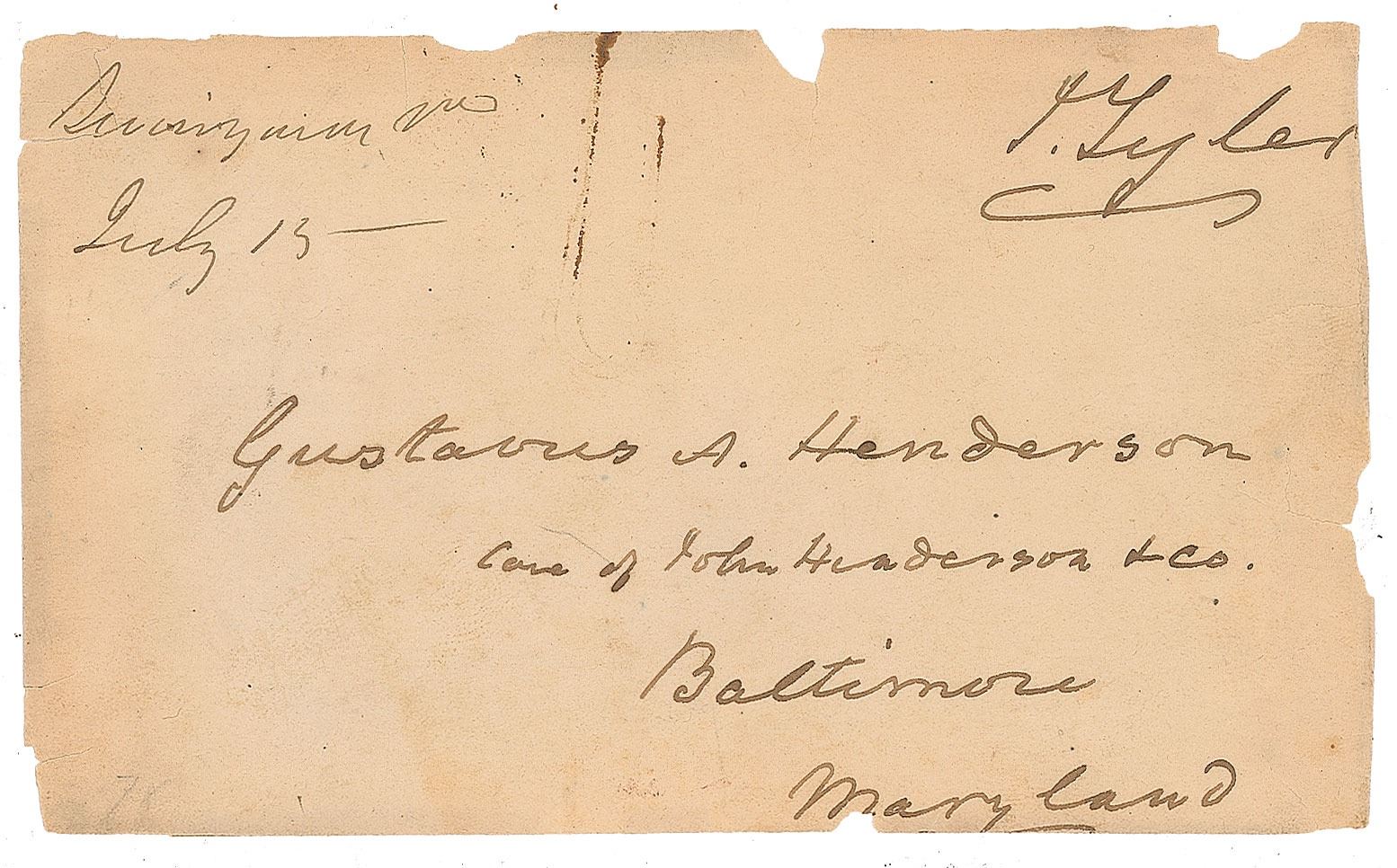 Hand-addressed and free franked mailing panel, 5 x 3, addressed by Tyler to "Gustavus A. Henderson, care of John Henderson & Co., Baltimore, Maryland," and franked in the upper right, "J. Tyler." In very good to fine condition, with edge chips and tears, and a rusty paperclip impression to the top edge.