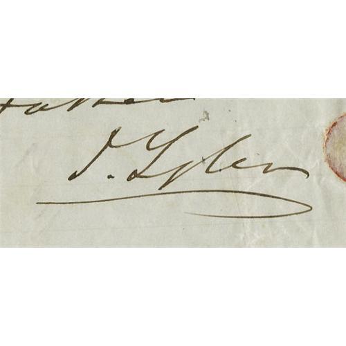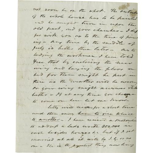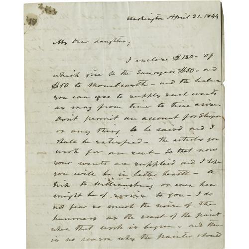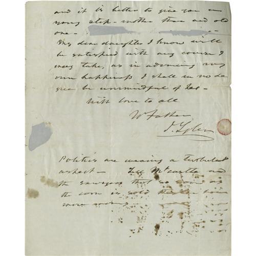 <B>John Tyler writes a personal letter as President to his daughter regarding his second marriage, "...it is better to give you a young step-mother than an old one."</B></I> Autograph Letter Signed, three pages, measuring 8" x 10". Written at Washington, April 21, 1844. Fine but for repairs to verso of page three and a few scattered stain marks. <BR><BR>The letter written from Washington to his daughter Mary reads in full: "<I>My dear daughter. I enclose $120 of which to give to the sawyers $50- and $50 to mount with - and the balance you can use to supply such wants as any from time to time arise. Don't permit an account for .... or any thing he said and I shall be satisfied - the articles you wish for are sent - so that now your wants are supplied and I hope you will be in better health - a trip to Williamsburgh or even here might be of service to you - I do not fear so much the noise of the hammers or the scent of the paint where that work is begun and there is no reason why the painter should not soon be on the spot - The outside of the whole house has to be painted and he might turn in upon the old part, and your chamber - I differ with you as to the time of pointing - any time by the middle of July is better than later - as to lodging the workmen and have told . . . that by enclosing the new wing and laying the floor a bed for them might be put in there as the weather will be warmer or your wing might answer still better - If at any time you choose to come over here let me know. Letty will reign in for a short time and then may have to give place to another -I have received a proposition to address, a lady worth 300,000 in cash besides houses . . . but if I get married at all it will to J.G, or no one - she is the greatest thing now living and it is better to give you a young step-mother than an old one. My dear daughter I know will be satisfied with any course I may take, as in advancing my own happiness I shall in no degree be unmindful of her - with love to all. Your father, J. Tyler.</B></I>" A postscript is added "<I>politics are wearing a turbulent aspect - Tell Mr. Castle and the Sawyers that as soon as the ... is sold they can have more money.</B></I>" Tyler's postscript is a likely reference to his last act in office regarding the bill annexing Texas from Mexico and extending the territory of slave-holding states and unbalancing the Missouri Compromise. The consequence of this act triggered the war with Mexico. Two months after the letter was written, Tyler married "J.G.", Julia Gardiner, whom Tyler met in 1842 when Julia and her family visited Washington. Tyler kept his marriage to Gardiner a secret until the ceremony was performed. He had only asked his son John Tyler Jr. to be present at the nuptials. The rest of the children were understandably upset and hurt. It was difficult for Mary to adjust to her new stepmother who was only five years older than she was. Letitia, Tyler's daughter by his first wife, never made peace with Gardiner. A delightful letter from this accidental president.