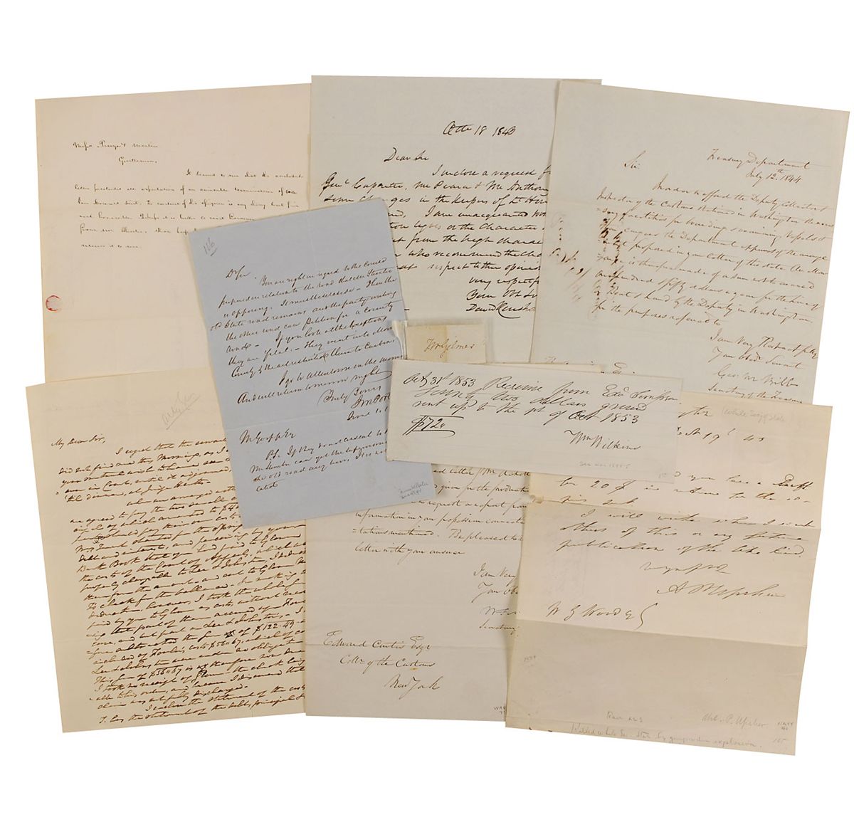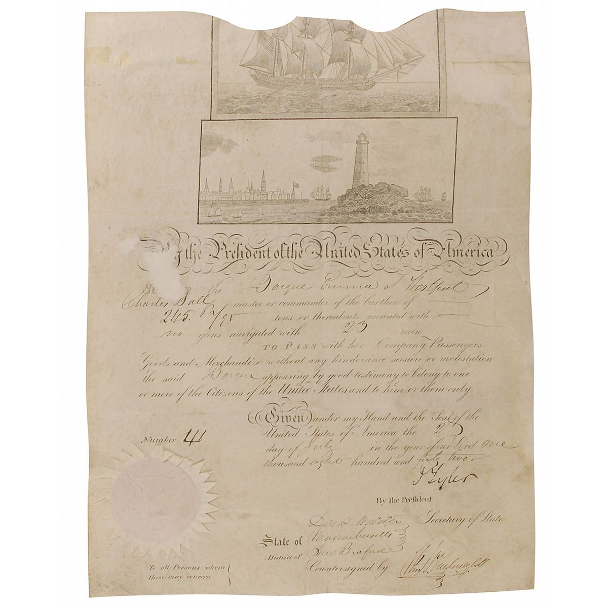 Partly-printed vellum DS as president, signed “J. Tyler,” one page, 11 x 14.5, July 2, 1842. Scalloped-top ship’s pass reads, in part: “Suffer the Barque Emma of Westport, Charles Ball master or commander…mounted with no guns navigated with 23 men to pass with her Company Passengers, Goods and Merchandise without any hinderance, seizure or molestation.” Signed at the conclusion by Tyler and countersigned by Daniel Webster. White paper seal affixed to the lower left remains fully intact. In very good condition, with intersecting folds, scattered creases, light scattered foxing and soiling, mounting remnants to the front (affecting a portion of the main text), and show-through from mounting remnants to reverse. Accompanied by nine letters, documents, and slips, each signed by a member of his cabinet. Signers are: William Wilkins, Abel P. Upshur, Thomas W. Gilmer, David Henshaw, John C. Spencer, George M. Bibb, James M. Porter, John Nelson, and Walter Forward. Various folds, light creases, toning, and pencil notations, otherwise overall fine condition.