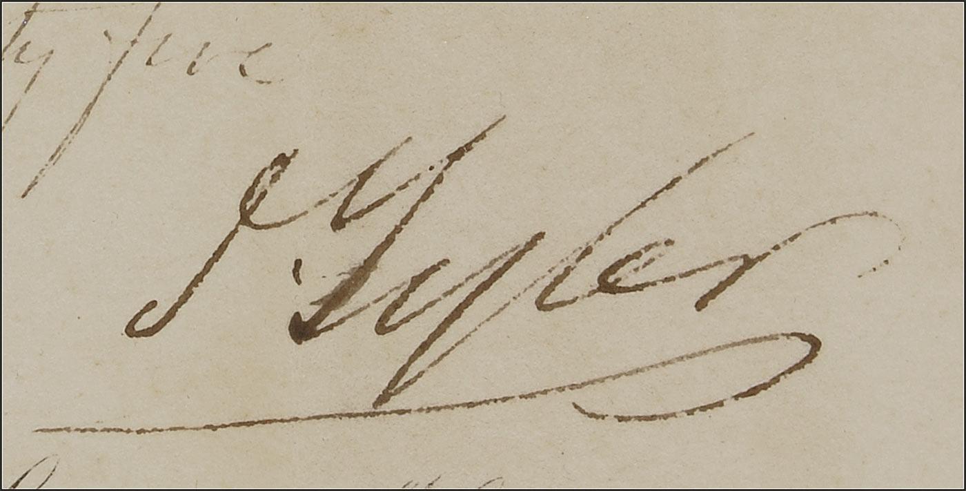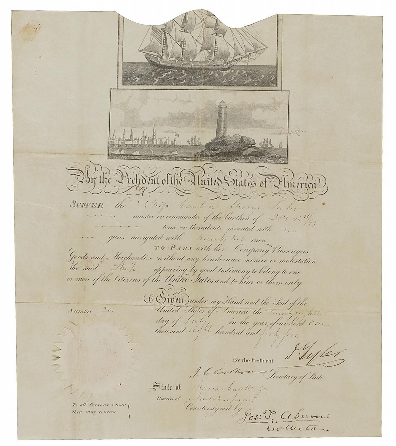 Scalloped-top vellum partly printed DS, signed as president, “J. Tyler,” one page, 13 x 15, July 28, 1845. Ship’s pass issued to “the Ship Canton, George Faber master and commander…mounted with no guns navigated with twenty two men.” Signed at the conclusion by Tyler, and countersigned by Secretary of State John C. Calhoun. In very good condition, with intersecting folds, one through a single letter of signature, a uniform shade of mild toning, scattered light creasing and wrinkling, and a small stain to top left corner. The embossed white seal is intact with a vertical crease to left side.