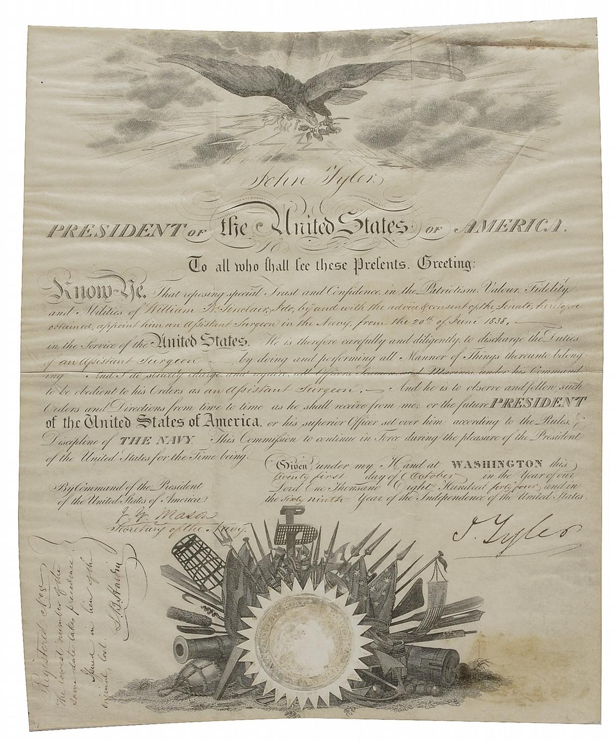 Partly-printed DS, signed as president, “J. Tyler,” one page, 13.5 x 16.5, October 21, 1844. Tyler appoints William Sinclair “an Assistant Surgeon in the Navy.” Signed at the conclusion by Tyler, and countersigned by Secretary of the Navy John Y. Mason. Intersecting folds, trimmed top edge, several areas of adhesive remnants, and some light toning and wrinkling, otherwise very good condition.