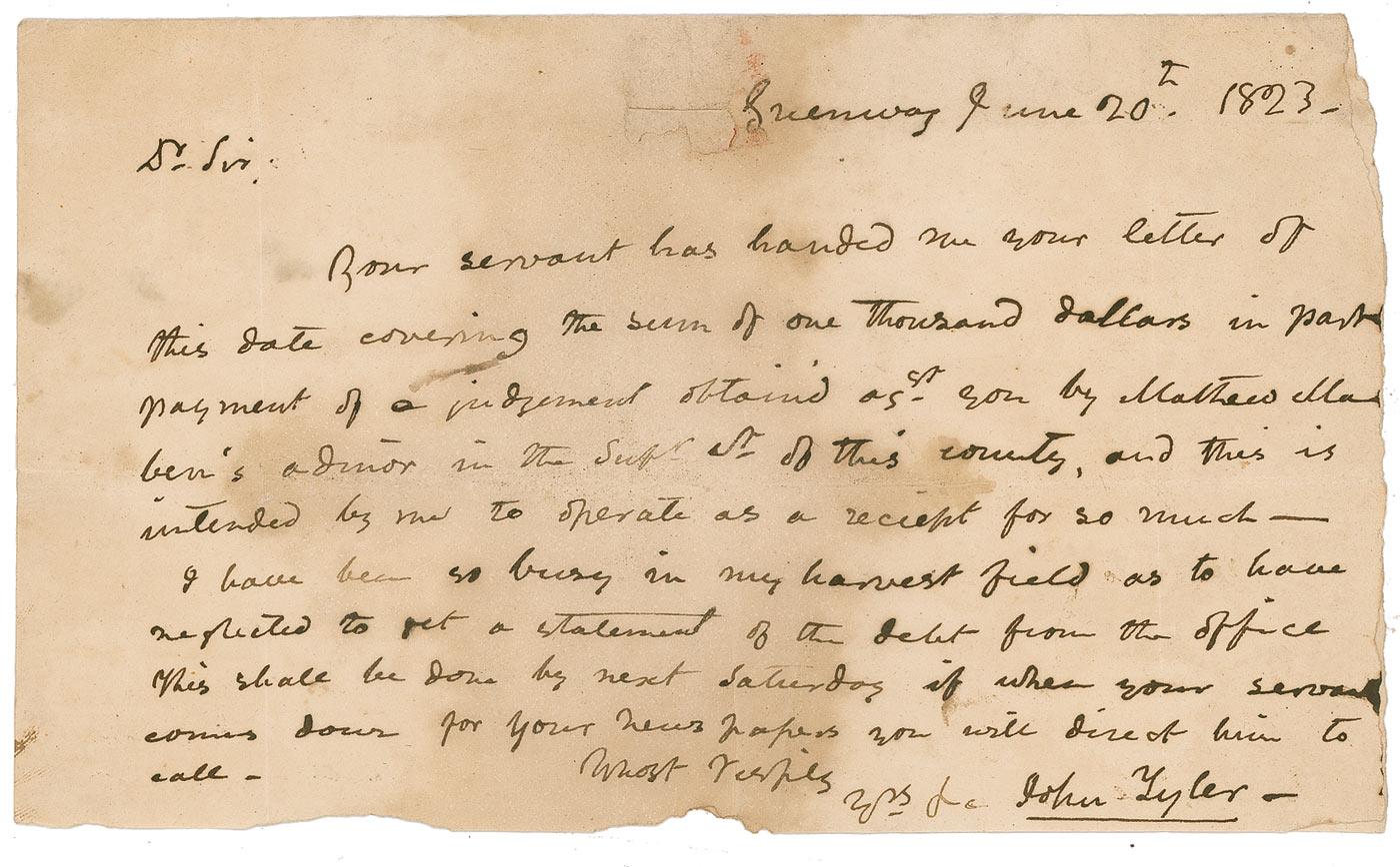 ALS, one page, 7.75 x 4.75, June 20, 1823. Tyler writes Benjamin Harrison, Esquire, of Berkeley. In part: “Your servant has handed me your letter of this date covering the sum of one thousand dollars in partial payment of a judgement obtained agst you…in the Supr. Ct. of this county, and this is intended by me to operate as a reciept [sic] for so much. I have been so busy in my harvest field as to have neglected to get a statement of the debt from the office. This shall be done by next Saturday if when your servant comes down for your newspapers you will direct him to call.” In very good condition, with intersecting horizontal and vertical folds, moderate soiling in the center of the page, and edge chipping.