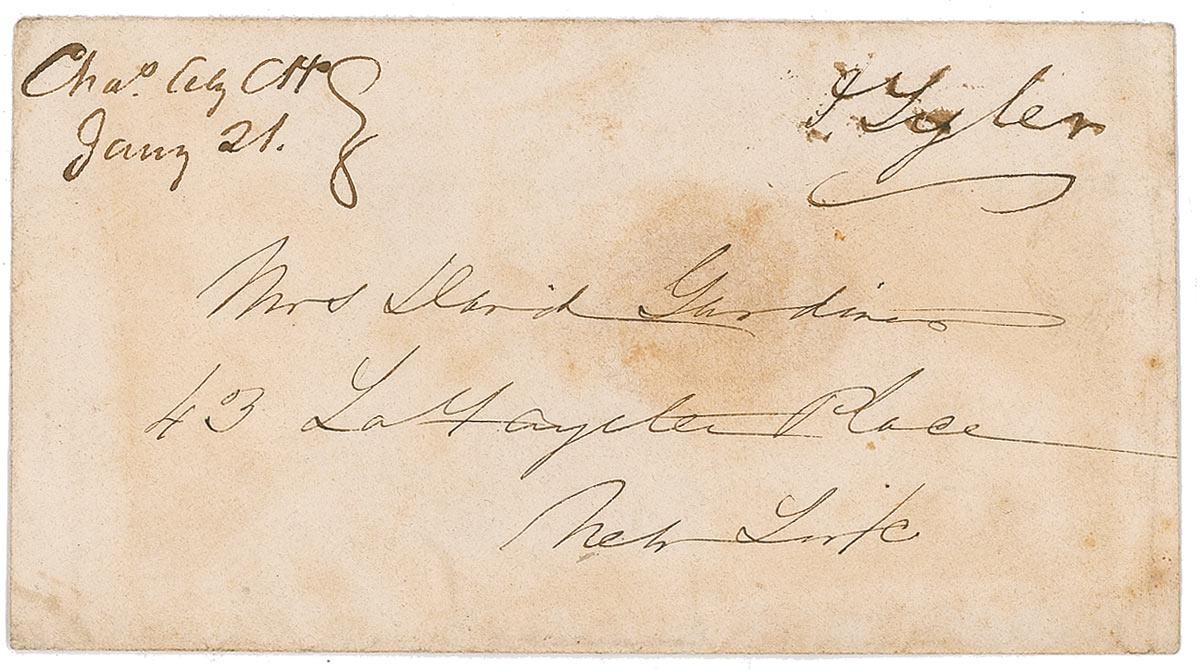 Free franked mailing envelope, 4.5 x 2.5, addressed in another hand to “Mrs. David Gardiner, 43 LaFayette Place, New York,” and franked in the upper right, “J. Tyler.” In another hand in the upper left corner is the return address and post date. In very good condition, with scattered toning and foxing, a few wrinkles and creases, and some light ink spots and feathering to signature.