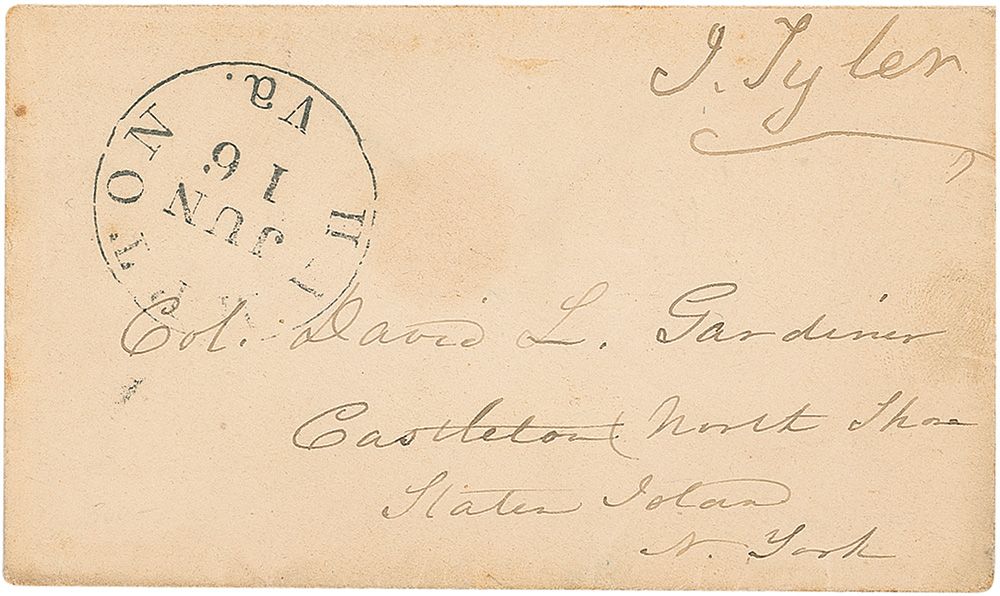 Free franked mailing envelope, 4.25 x 2.5, addressed in another hand to “Col. David L. Gardiner, Castleton North Shore, Staten Island, N. York,” and franked in the upper right, “J. Tyler.” Envelope also bears a June 16, Hampton, Virginia postmark. In fine condition, with scattered light toning and soiling.