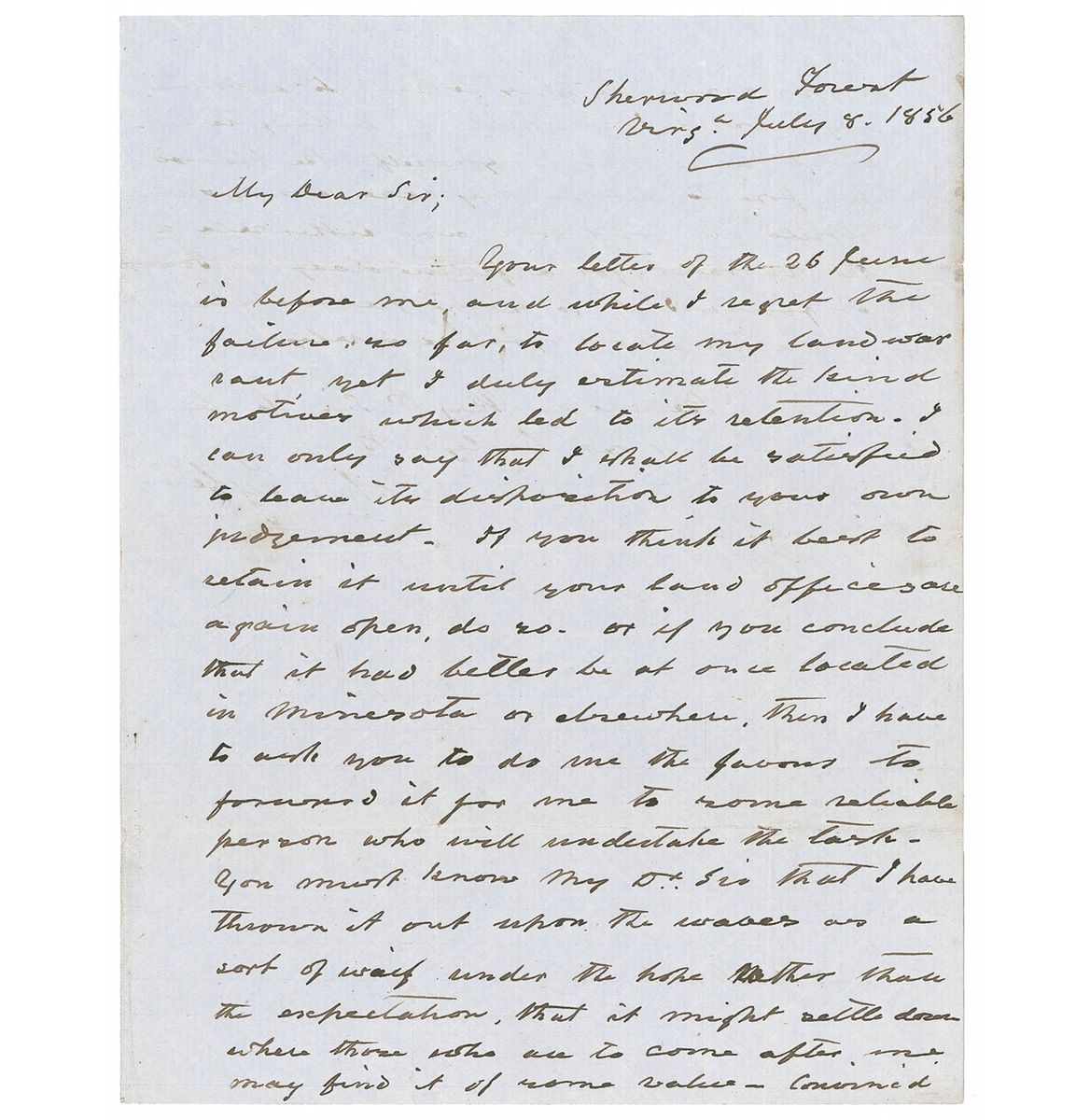 ALS, one page both sides, 8 x 10, July 8, 1856. Letter to attorney William Belknap. In full: “Your letter of the 26 June is before me and while I regret the failure so far,