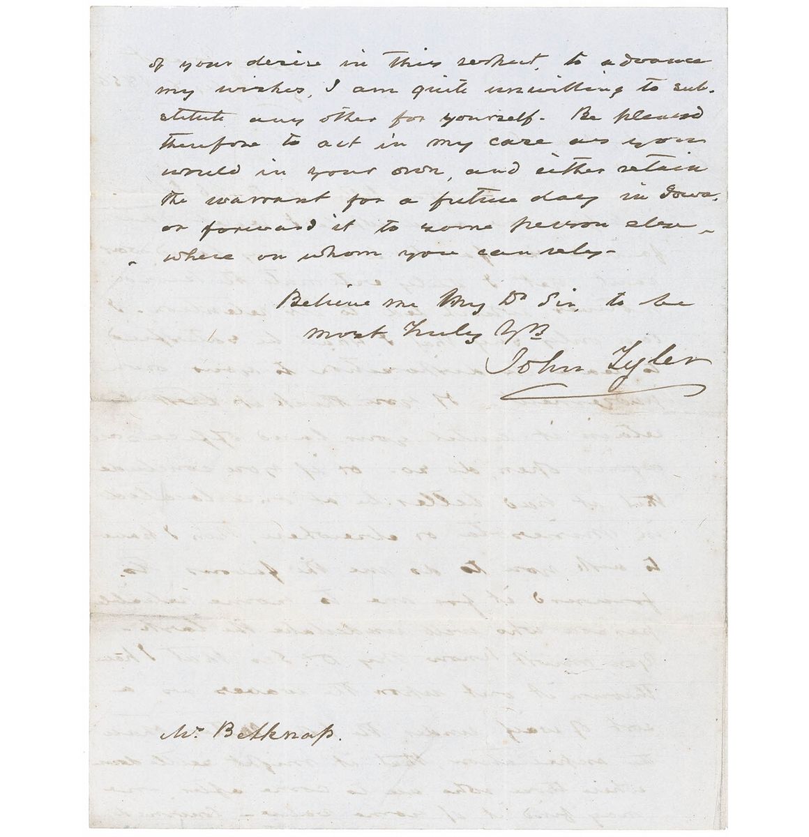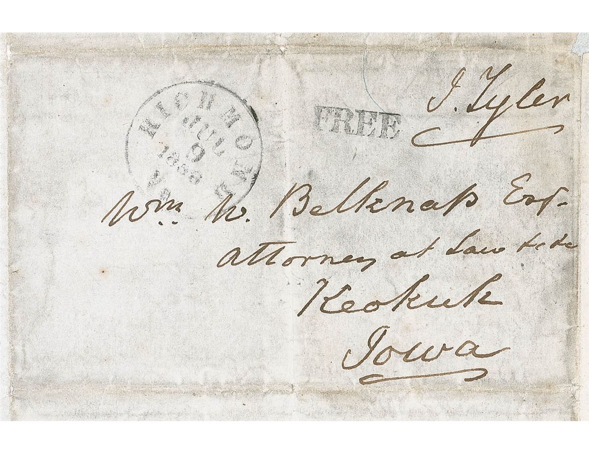 Second integral page bears a hand-addressed and free franked panel, addressed in Tyler’s hand to “Wm. W. Belknap, Esq., Attorney at law, Keokuk, Iowa,” stamped “Free” in the upper right, and franked, “J. Tyler.” Intersecting folds, one through a single letter of signature, scattered toning and soiling, a bit heavier along folds, and moderate soiling to address panel, otherwise fine condition.