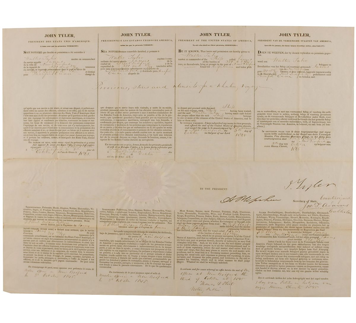 Partly-printed DS, signed as president “J. Tyler,” one page, 20.5 x 15.75, October 3, 1845. Four-language ship’s papers issued to Walter Taber, “master or commander of the ship called Janus…lying at present in the port of New Bedford bound for Pacific Oce