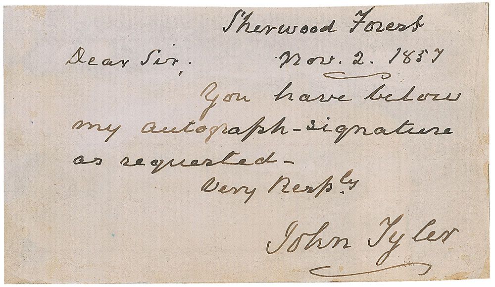 ANS, one page, 5 x 2.75, Sherwood Forest, November 2, 1837. Brief note to a gentleman. In full: “You have below my autograph-signature as requested.” Affixed to a same-size card. Mild scattered toning and slight rippling, otherwise fine condition.