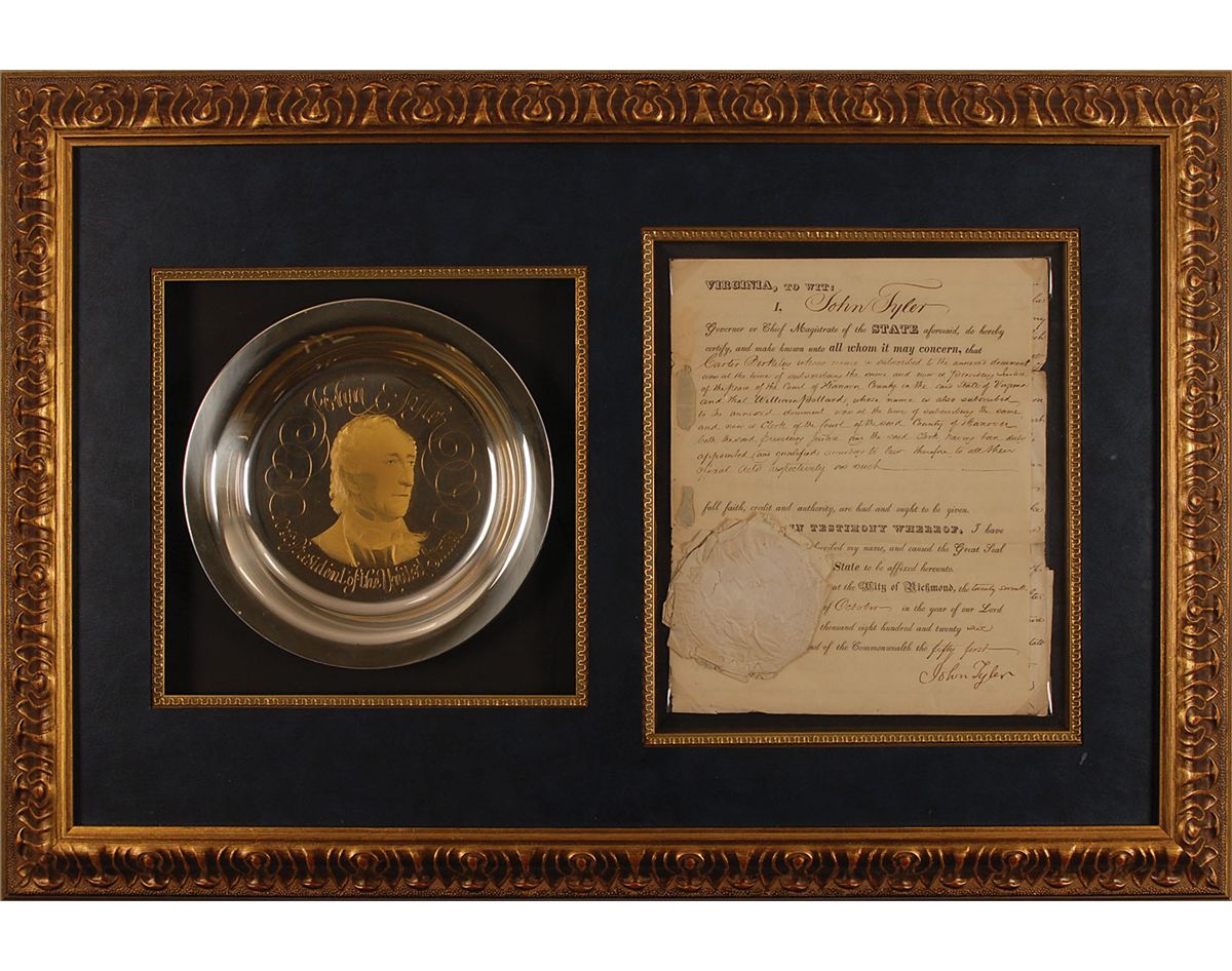 Partly-printed DS, one page, 8 x 9.5, October 27, 1826. Tyler, as governor of Virginia, appoints Carter Berkeley a justice of the peace and William Pollard a clerk of the court. Crisply signed at the conclusion by Tyler. Matted and framed with a second page visible behind the document, and a gold-inlaid, sterling silver portrait plate issued in a limited edition by the Franklin Mint in the early-to-mid 1970s, to an overall size of 27 x 18. Uniform light toning, and creases and small tears to lower left corner, otherwise fine condition. Oversized.