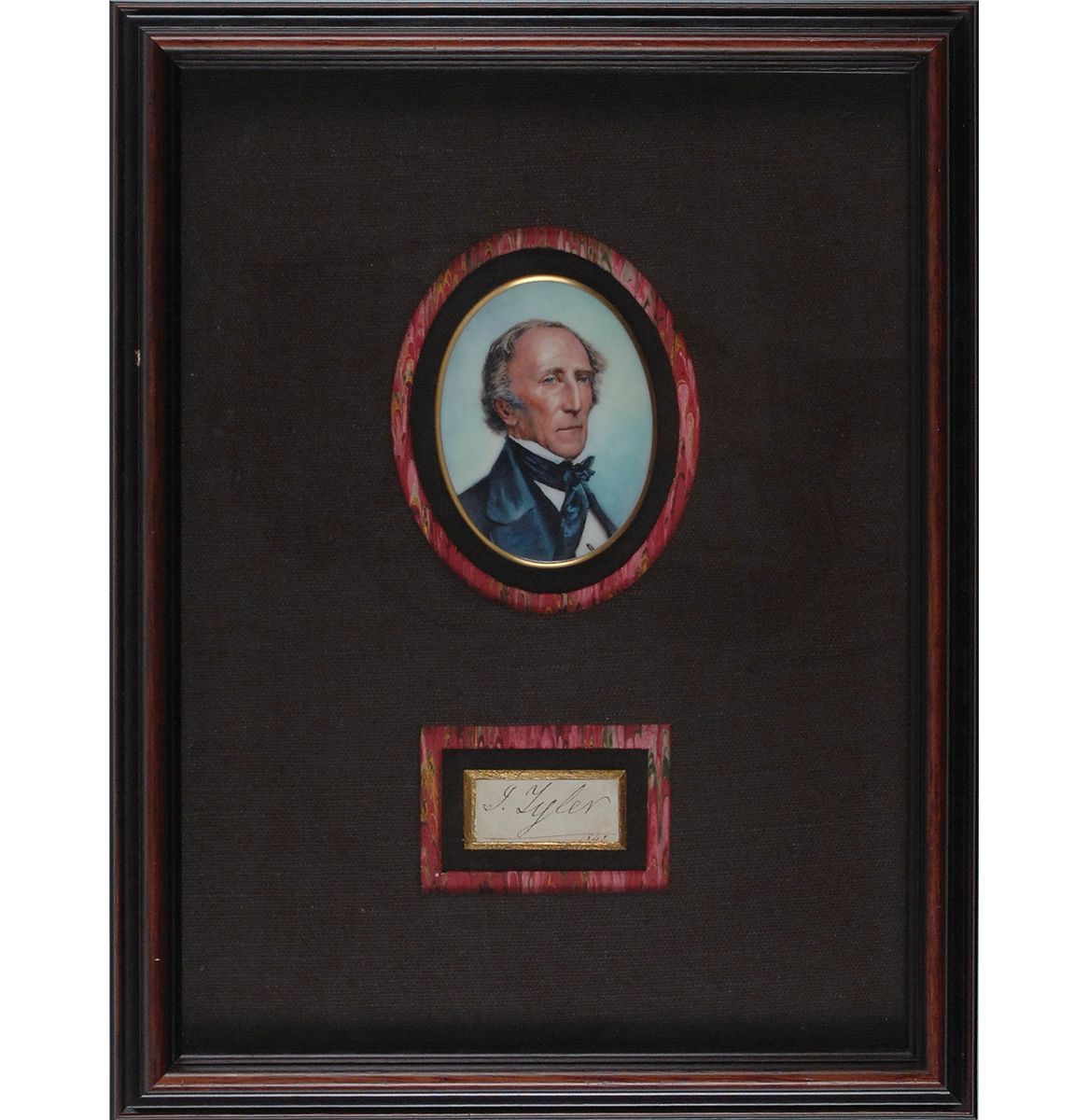 Ink signature, most likely as president, “J. Tyler,” on an off-white 1.75 x .75 slip, dated “1842,” in an unknown hand. Slip is affixed to a slightly larger mount and double-cloth-matted and framed with a color cameo portrait to an overall size of 10.25 x 13.5. In fine condition.