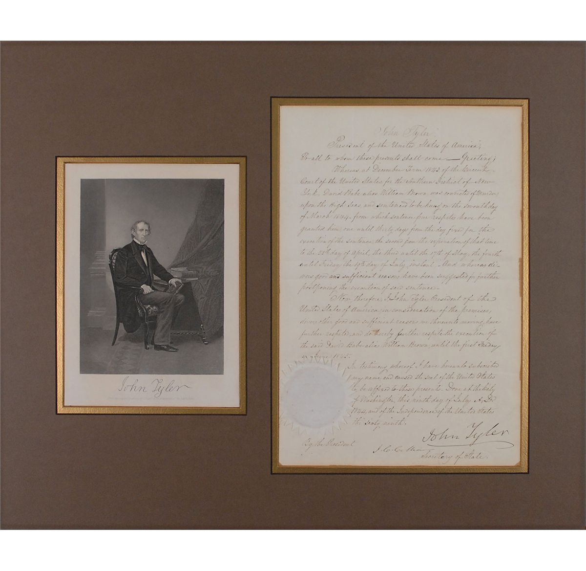 Manuscript DS as president, one page, 9.25 x 13.75, July 9, 1844. Document reads, in part: “Whereas…David Babe alias William Brown, was convicted of murder on the High Seas, and sentenced to be hung on the seventh day of March 1844 from which sentence four respites have been granted him…And whereas divers good and sufficient reasons have been suggested for further postponing the execution of said sentence—Now, therefore, I, John Tyler, President of the United States of America…have further respited, and do hereby further respite the execution of the said David Babe alias William Brown, until the first Friday in June 1845.” Signed at the conclusion by Tyler and countersigned by Secretary of State John C. Calhoun. Double-matted with a portrait of Tyler to an overall size of 22.5 x 19. In fine condition, with intersecting folds, one through a single letter of signature, and a few areas of toning to edges. The paper seal is crisp and intact. Research indicates that Brown was eventually pardoned by President Polk. Such highly important stays are seldom seen.