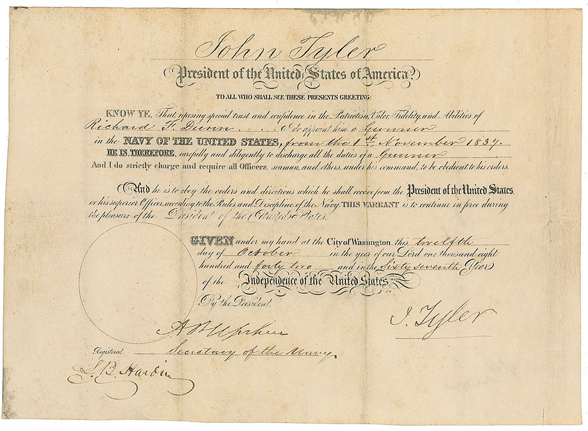 Partly-printed vellum DS as president, signed “J. Tyler,” one page, 11.25 x 8, October 12, 1842. President Tyler appoints Richard F. Dunn as “a Gunner in the Navy of The United States.” Signed at the conclusion by Tyler and Secretary of the Navy Abel P. Upshur. Seal is absent. In very good condition, with intersecting folds (one vertical fold passing through a single letter of the signature), light scattered creases and toning, and mild overall foxing.