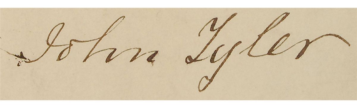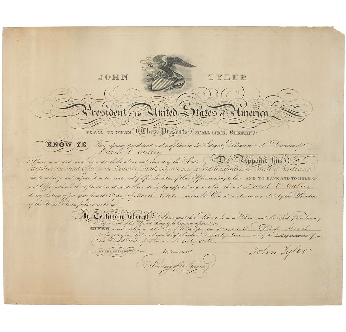 Partly-printed DS as president, one page, 17 x 14, March 17, 1842. President Tyler appoints David V. Culley as “Paymaster of the Land Office for the District of Lands subject to sale at Indianapolis in the State of Indiana.” Boldly signed at the conclusion by Tyler and countersigned by Secretary of the Treasury Walter Forward. Document bears an embossed seal to the lower left. In very good condition, with scattered creases and toning, a few slight tape-repaired edge tears, and a small area of paper loss to the upper right corner tip.