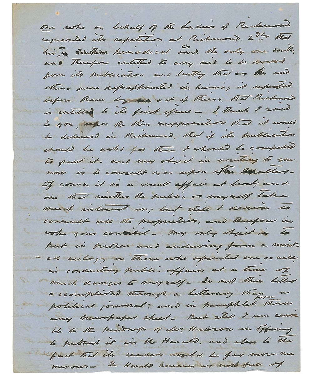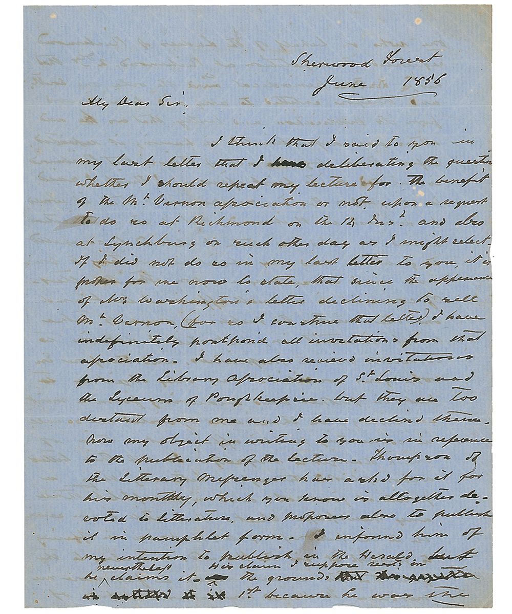 Remarkable ALS, signed “J. Tyler,” three pages on two adjoining sheets, 7.75 x 10, dated June [18], 1856. Letter to Colonel John S. Cunningham in Washington, DC. In part: “I think that I said to you in my last letter that I have [sic, was] deliberating the question whether I should repeat my lecture for the benefit of the Mt. Vernon Association or not, upon a request to do so at Richmond on the 14 July and also at Lynchburg on such other day as I might select. If I did not do so in my last letter to you, it is proper for me now to state, that since the appearance of Mr. [John A.] Washington’s letter declining to sell Mt. Vernon (for so I construe that letter), I have indefinitely postpon’d all invitations from that association. I have also recievd [sic] invitations from the Library Association of St. Louis and the Lyceum of Poughkeepsie, but they are too distant from me and I have declined them…