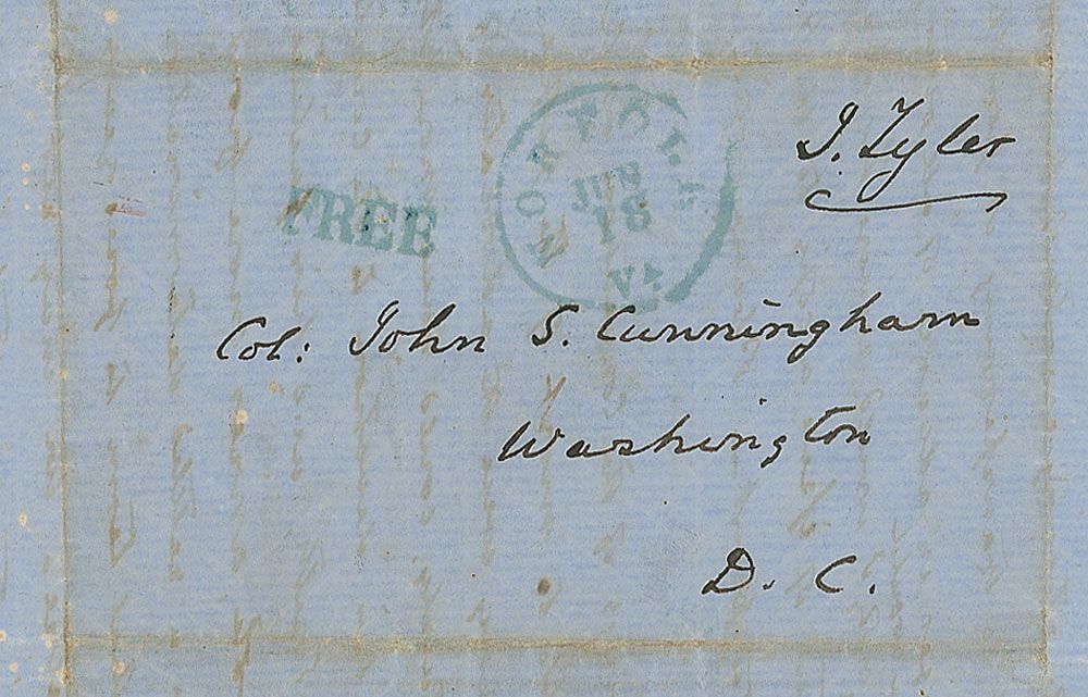 Reverse of second page bears an address panel in Tyler’s hand to “Col. John S. Cunningham, Washington, D.C.,” free-franked in the upper right, “J. Tyler,” and bearing a “Free” stamp and a June 18, Norfolk cancellation.