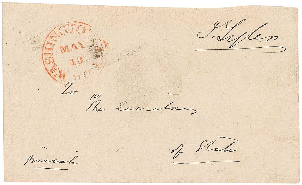 Hand-addressed and free-franked envelope, 5.5 x 3.25, addressed “To the Secretary of State,” and franked in the upper right, as president, “J. Tyler,” and marked “private” in the lower left corner. Envelope bears a May 13, Washington, D. C. postmark, and retains its red wax presidential seal on the reverse. In fine condition, with scattered light creases and wrinkles, and missing flap.