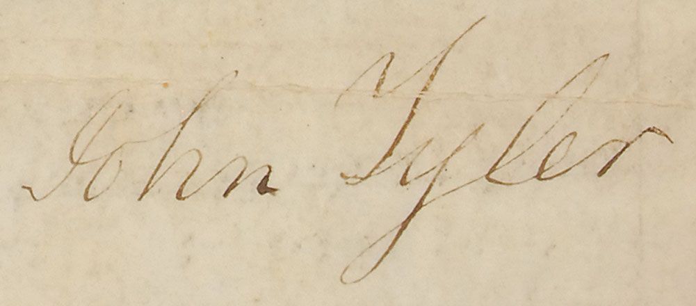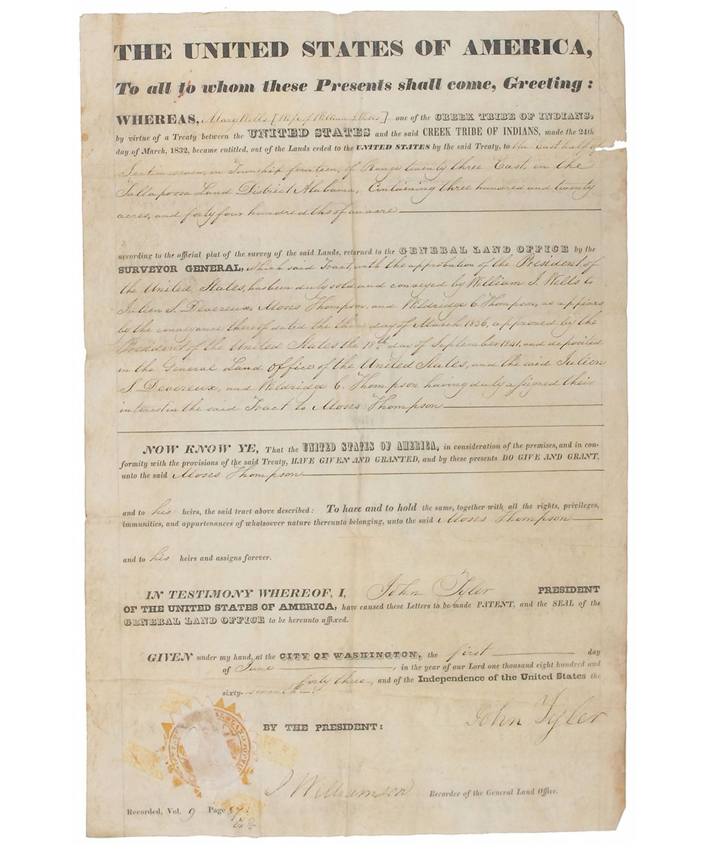 Partly-printed DS as president, one page, 11.5 x 17.5, June 1, 1843. “Whereas, Mary Wells (Wife of William J Wells) one of the Creek tribe of Indians, by virtue of a Treaty between the United States and the said Creek tribe of Indians, made the 24th day of March 1832, became entitled, out of the Lands ceded to the United States by the said Treaty, to the East half of the Section, in Township fourteen of Range Twenty three East, in the Tallapoosa Land District Alabama, containing three hundred and twenty acres, and forty four hundreths of an acre.” Signed at the conclusion by Tyler and countersigned by Recorder of the General Land Office J. Williamson. In very good condition, with intersecting folds, one passing through the upper portion of a couple letters of last name of signature, scattered toning, and a small area of paper loss to right edge. On March 24, 1832, the Creek Tribe and US government agreed to the Treaty of Cusseta, which moved most of the tribe to Oklahoma. After two Creek rebellions with the military, most of them did move, with a few allowed to remain with land allotments and protection. Those remaining in Alabama eventually became the Poarch Band of the Creek Tribe, living on 230 acres on the only Federal reservation in Alabama. Around the beginning of Tyler’s second term, most land grants were secretarially-signed. In 30 years, only three of these Indian US Government land grant documents from 1832 have come up for auction.