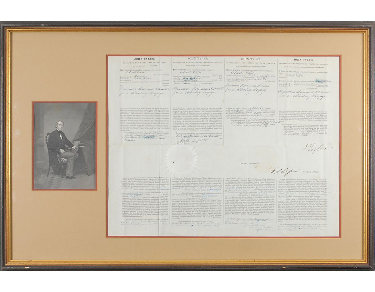 Partly-printed DS as president, signed “J. Tyler,” one page, 20 x 15.5, October 6, 1843. Four-language ship’s papers issued to “Clark Estes master or commander of the Ship called Rowena…lying at present in the port of Fall River…and laden with Provisions Stores and Utensils for a whaling voyage.” Signed in the fourth panel by Tyler and countersigned by interim Secretary of State H. S. Legare. Double-matted and framed with a portrait of Tyler to an overall size of 32.5 x 22. Intersecting folds, two passing through portions of signature, a few creases, and a couple of brushes to text, otherwise fine condition. The white wafer seal is crisp and intact. In its three-year voyage, the Rowena brought back over 3100 barrels of whale oil and 11 tons of bone. Oversized.
