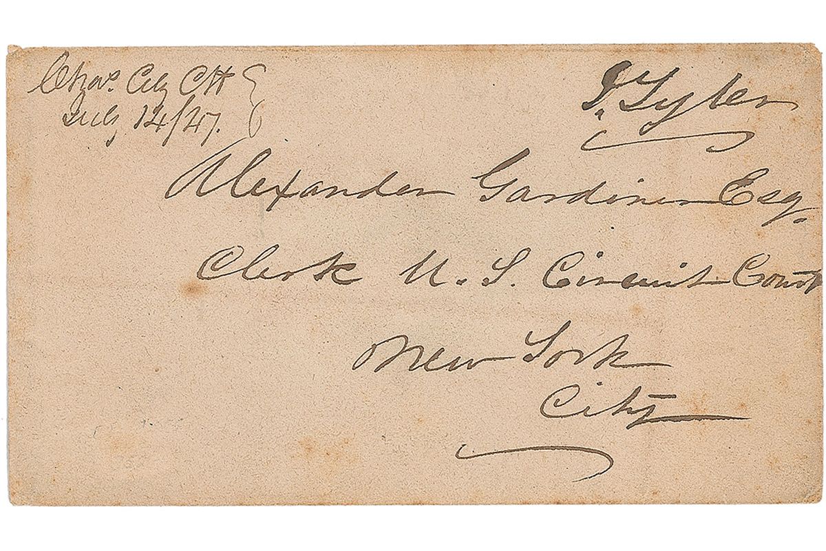 Hand-addressed free-franked envelope, 4.5 x 2.5, addressed in Tyler’s hand to “Alexander Gardiner, Esq., Clerk U. S. Circuit Ct., New York City,” and franked in the upper right, “J. Tyler.” Envelope also bears a small secretarial notation dated July 14, 1847 and retains its wax seal on the reverse. Scattered light toning, soiling, and foxing, and slight pooling of ink to first letter of signature, otherwise fine condition.